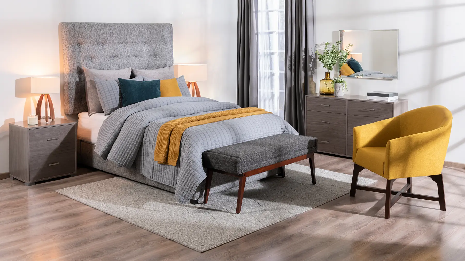 Центральное место в интерьере спальни занимает кровать. Остальная мебель дополняет доминанту, поэтому должна соответствовать ей по стилю и палитре. Впрочем, можно использовать одну-две разномастных моделей в качестве акцентов — яркого цвета или необычной формы.