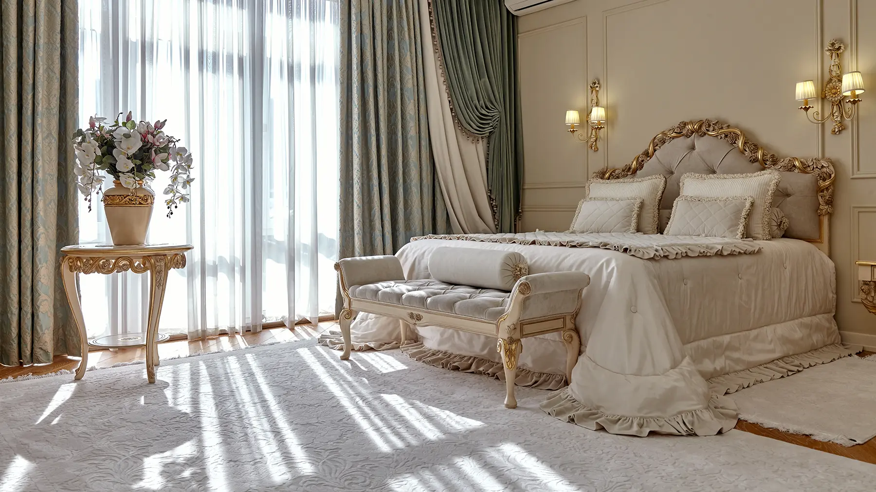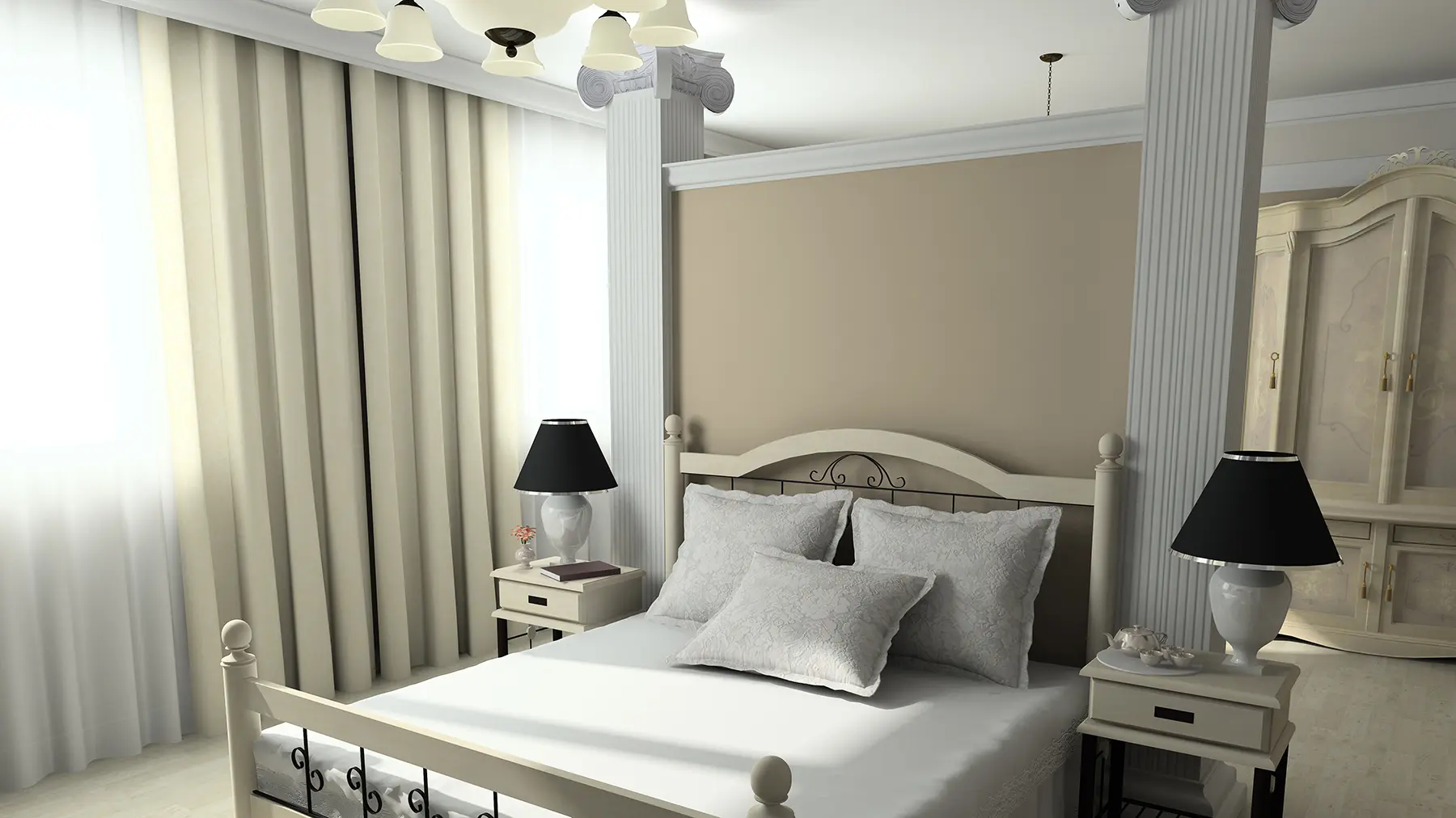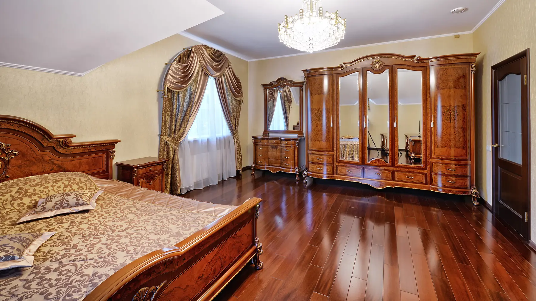 Классику лучше воплощать в больших спальнях — в маленьких обилие деталей может сыграть злую шутку и перегрузить интерьер. Для небольших комнат больше подойдет более простая и строгая неоклассика, где рядом с роскошной лепниной, тяжелыми портьерами, зеркалами в позолоченных рамах стоит современная мебель, техника и электроника.