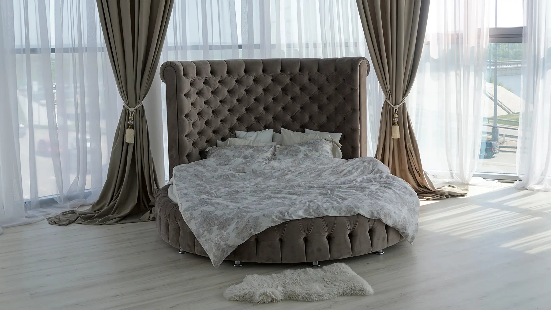 Для спальни с пространственными особенностями лучше всего подойдет мебель, сделанная по индивидуальным параметрам. Например, в комнату с круглыми углами хорошо впишется кровать такой же формы или радиусный шкаф.