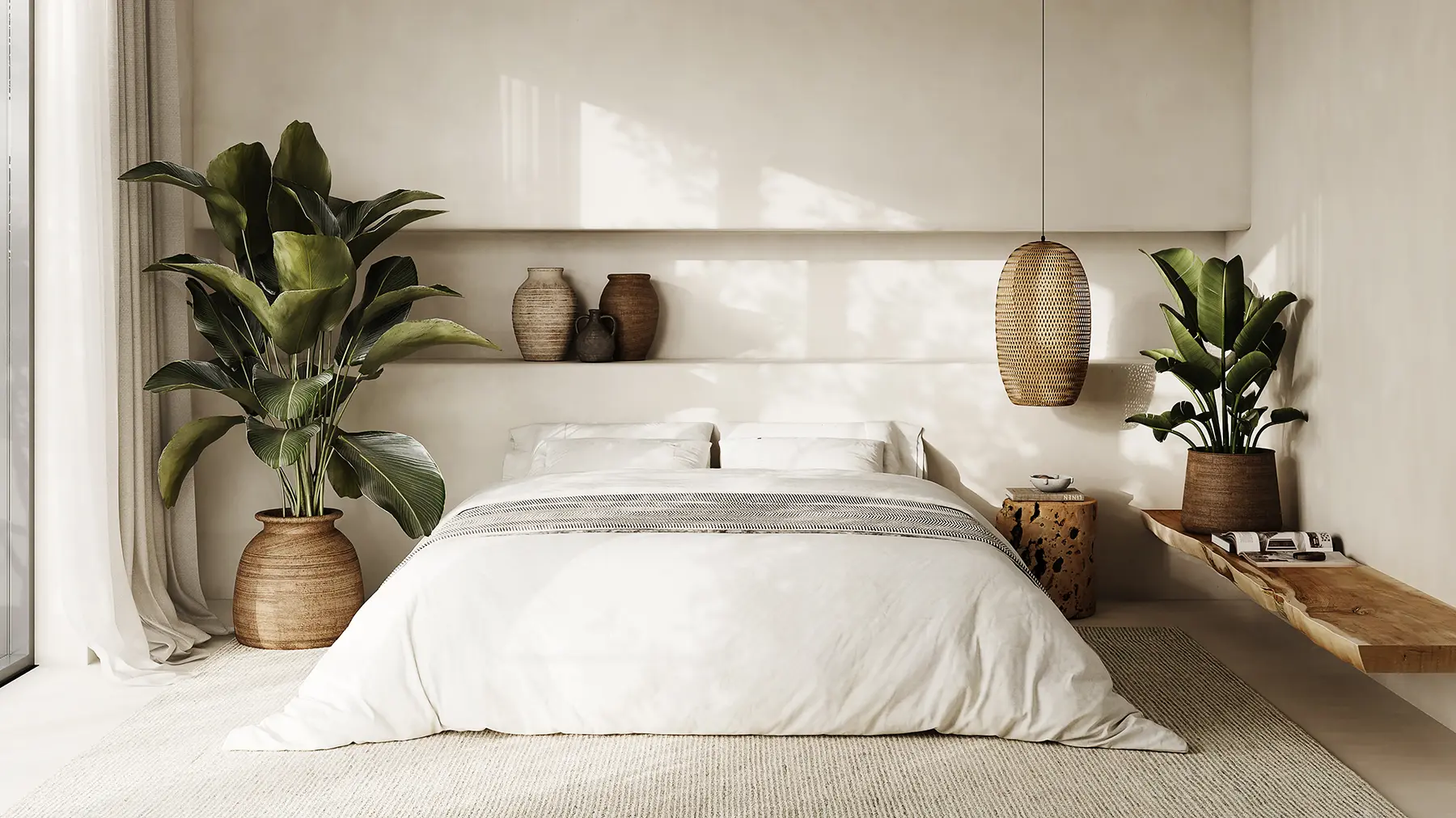 Главные черты интерьера — естественность и близость к природе. В оформлении используют натуральные материалы и фактуры: бумажные обои, лен, хлопок, дерево, бамбук и камень.