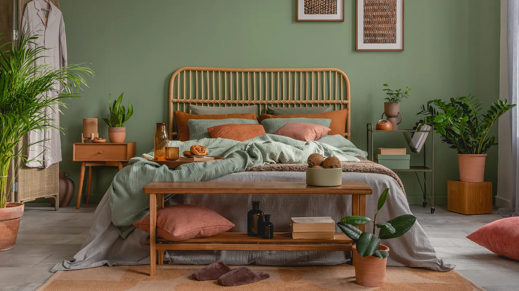 К природным цветам относят зеленый, песочный, голубой, серый и коричневый. Особенно рекомендуют для спален зеленые оттенки, создающие атмосферу покоя. Это может быть нежный шалфейный цвет, насыщенный моховый или изумрудный. Лучше всего зеленый сочетается с коричневым, бежевым и белым.