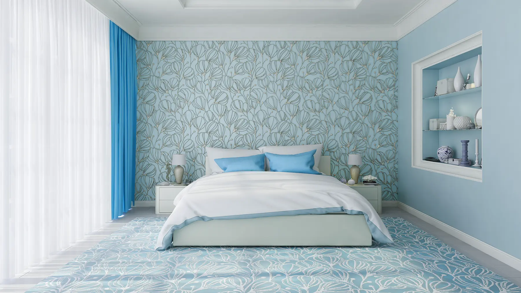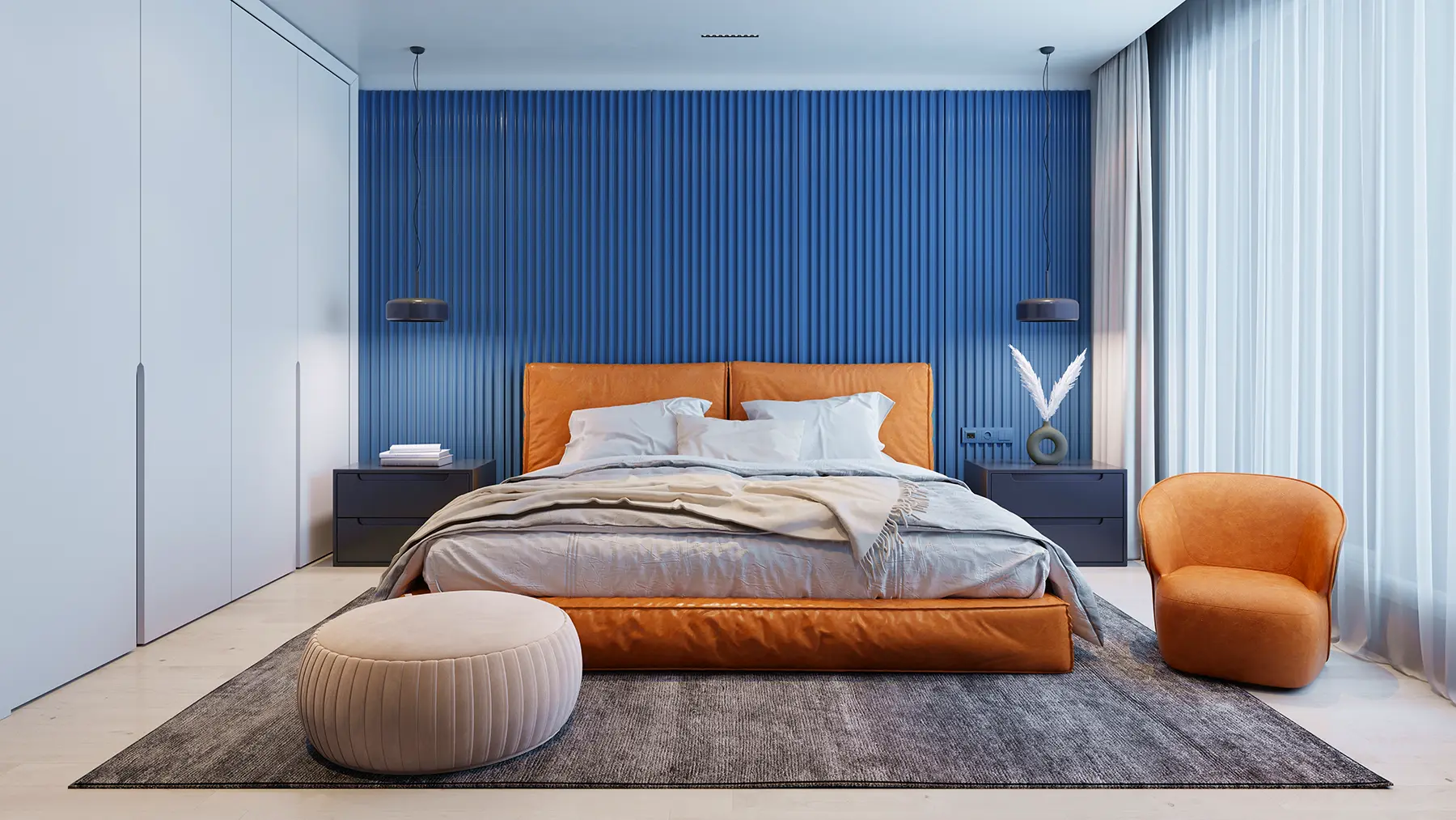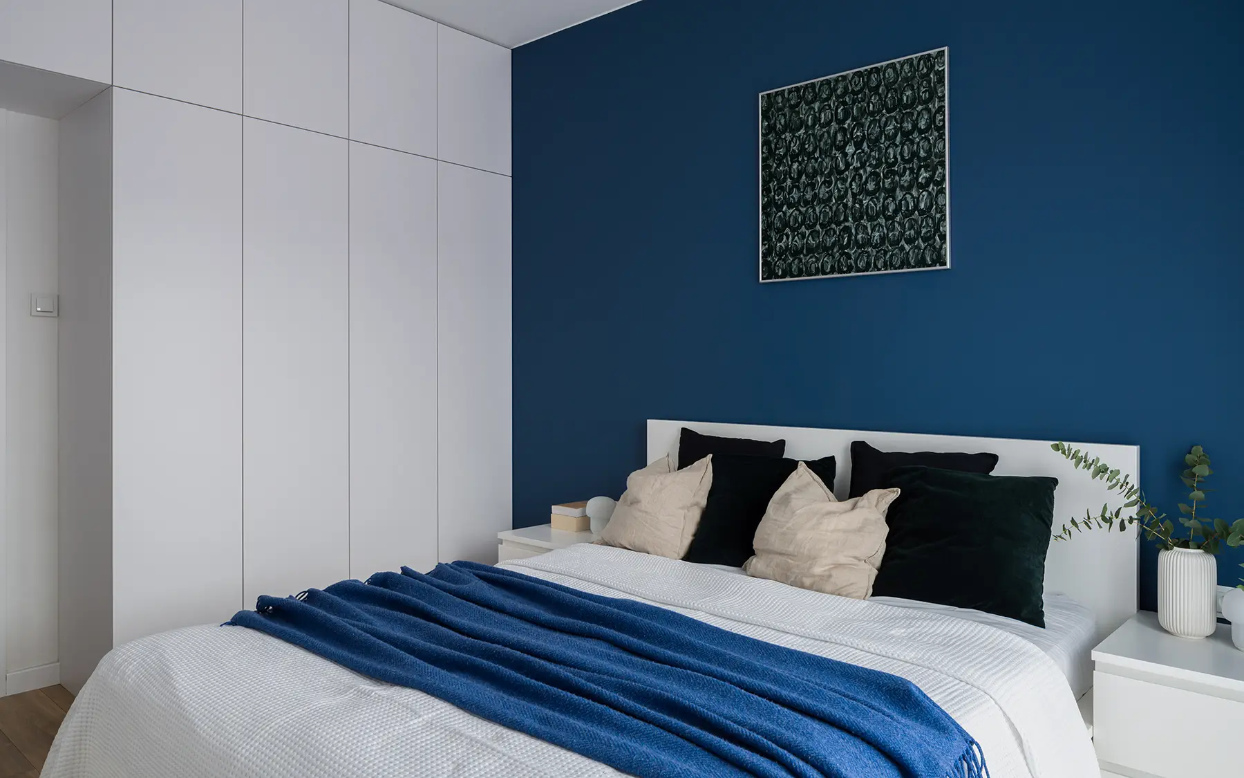 Строгий и успокаивающий, синий цвет отлично вписывается в интерьер спальни. Но его насыщенные оттенки лучше использовать точечно. К примеру, в темно-синий можно покрасить акцентную стену за изголовьем. Или купить ярко-синие подушки, покрывало, плед или занавески.