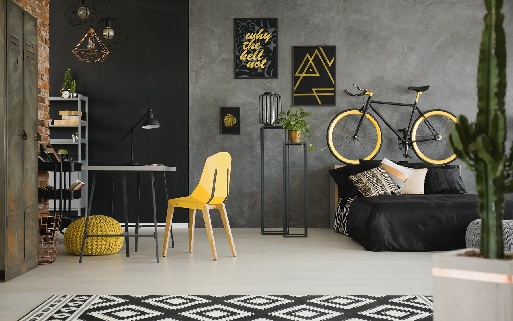 Интерьер в промышленном стиле — это много свободного пространства и света, мебель из металла или необработанной древесины, открытые коммуникации, отделка под кирпич или бетон. Цветовая палитра сдержанная: черный, бежевый, серый, белый и кирпичный. Чтобы интерьер не казался слишком мрачным, его оживляют с помощью контрастного цвета.