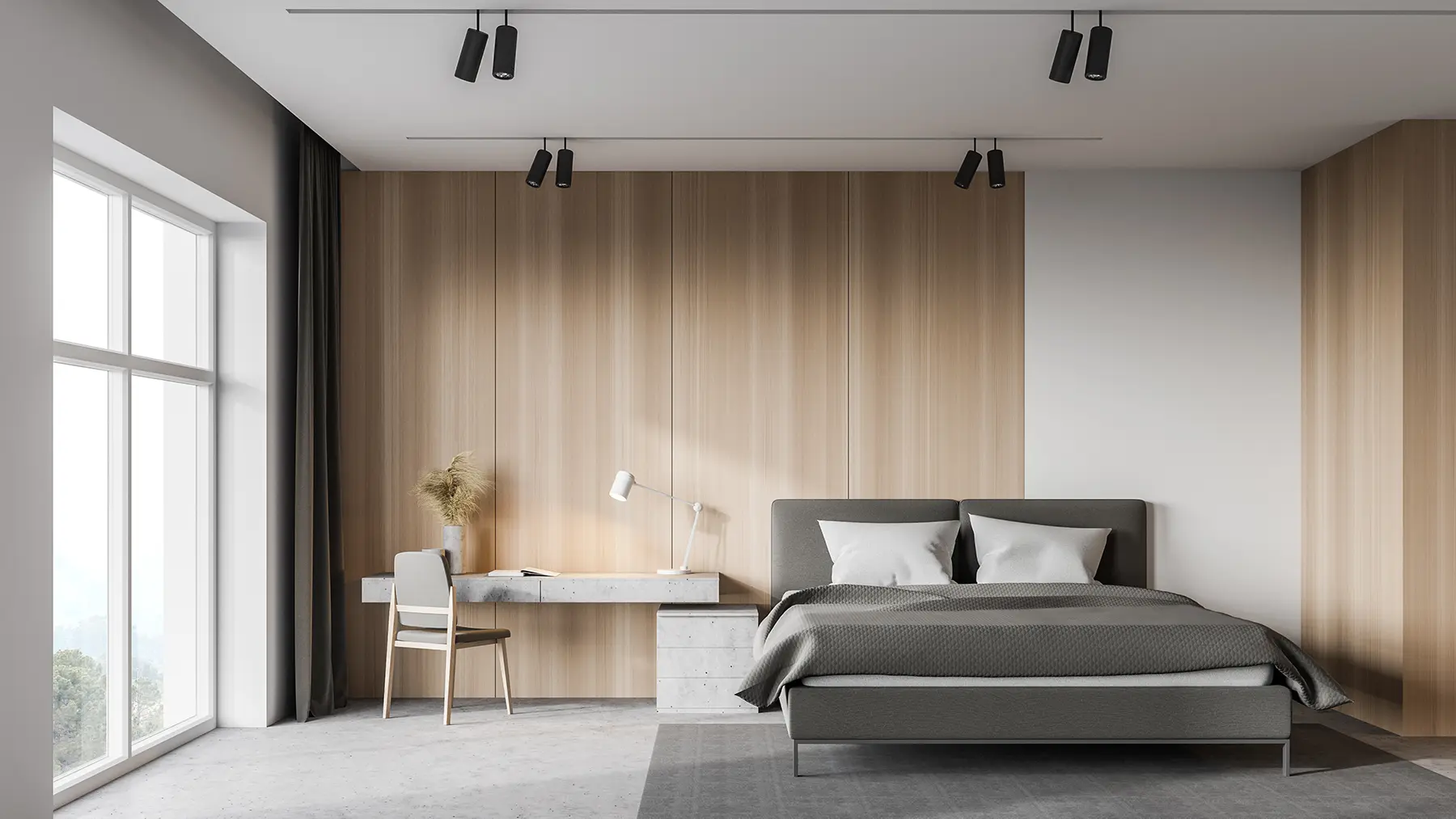 Освещение в спальне должно быть многоуровневым. Равномерный свет обеспечивают общие верхние источники — люстра, встраиваемые или накладные светильники. Кроме того, продумайте функциональное освещение. В прикроватной зоне, на рабочем месте и над туалетным столиком разместите светильники с направленным светом. Это могут быть бра, споты, настольные лампы, торшер и т. д.