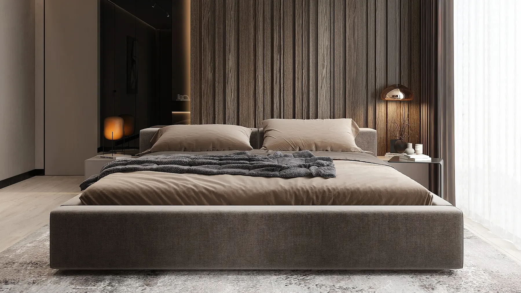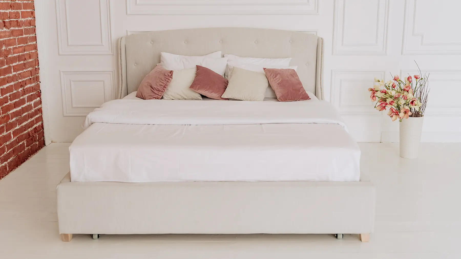 Если хотите добавить комнате уюта, советуем выбирать мягкое изголовье с тканевой обивкой. Актуальны шелк, бархат, лен, жаккард. Кроме того, сейчас на пике популярности обивка букле всевозможных оттенков.
