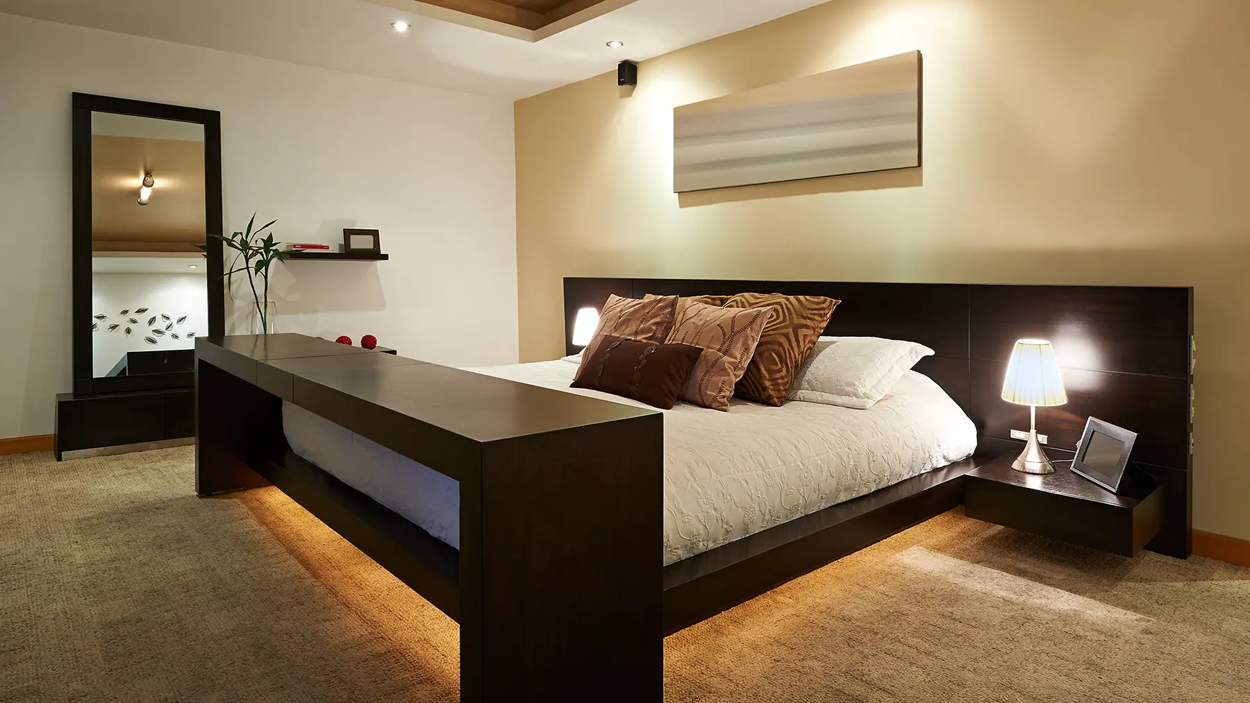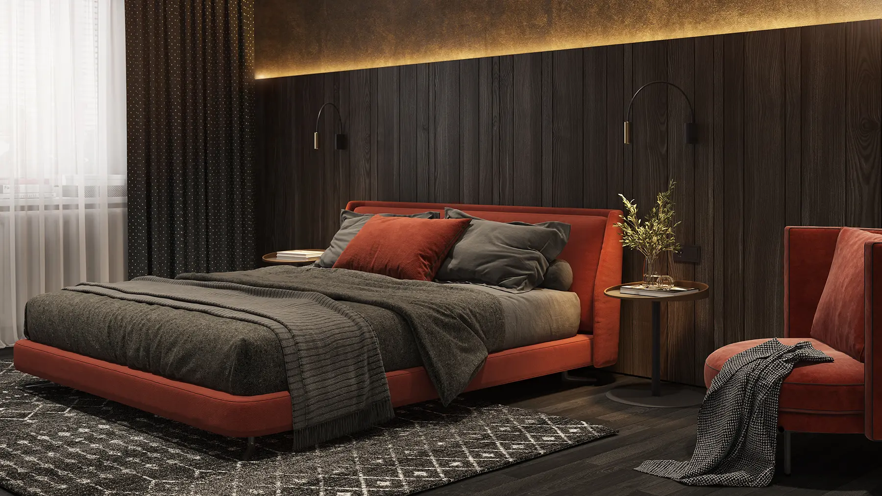 В больших спальнях уместно темное оформление. Можно использовать и яркие агрессивные цвета, такие как красный или оранжевый, но дозированно — как акценты.