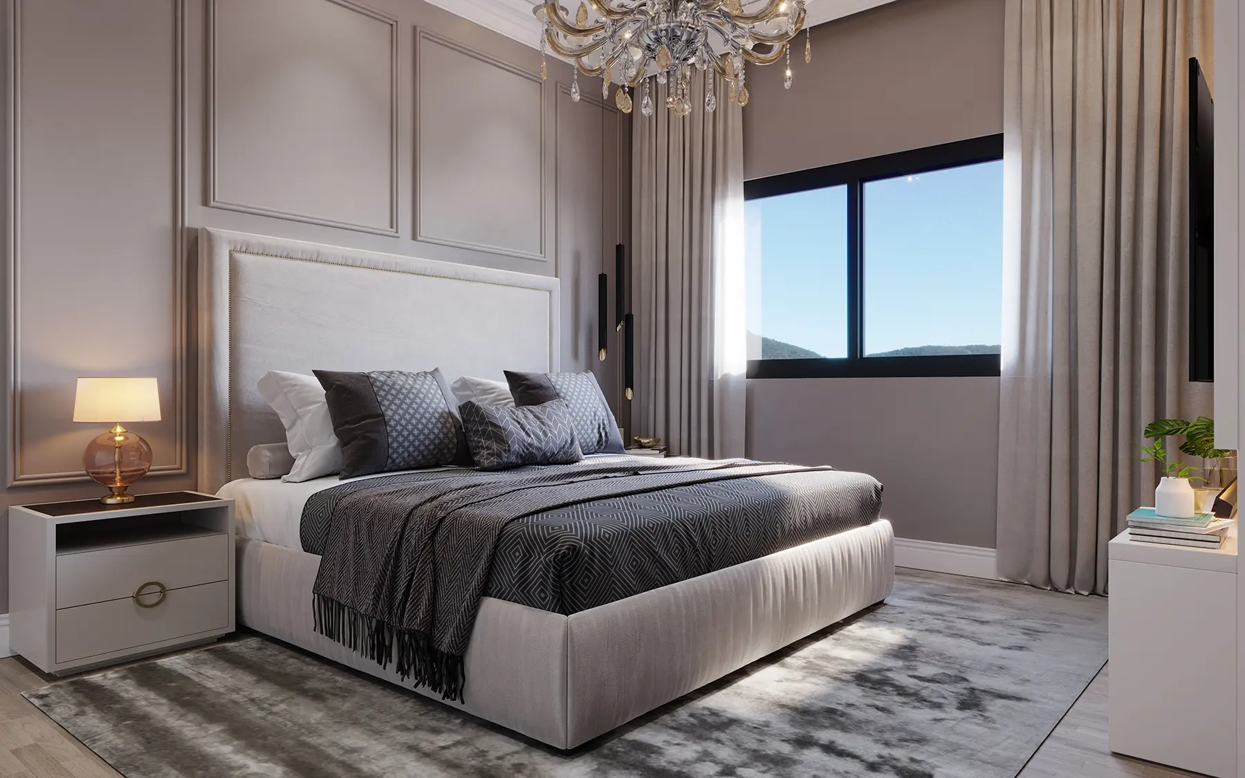 Современная спальня в классическом стиле — это сдержанная роскошь, комбинация элегантности и практичности. Интерьеру свойственны четкие геометрические формы, симметрия, прямые линии, много свободного пространства, элементы роскоши в декоре. В оформлении используют натуральные материалы, лепнину, витражи и художественную резьбу. Цветовая палитра приглушенная: бежевый, розовый, белый, оливковый, коричневый, кофейный и цвет слоновой кости.