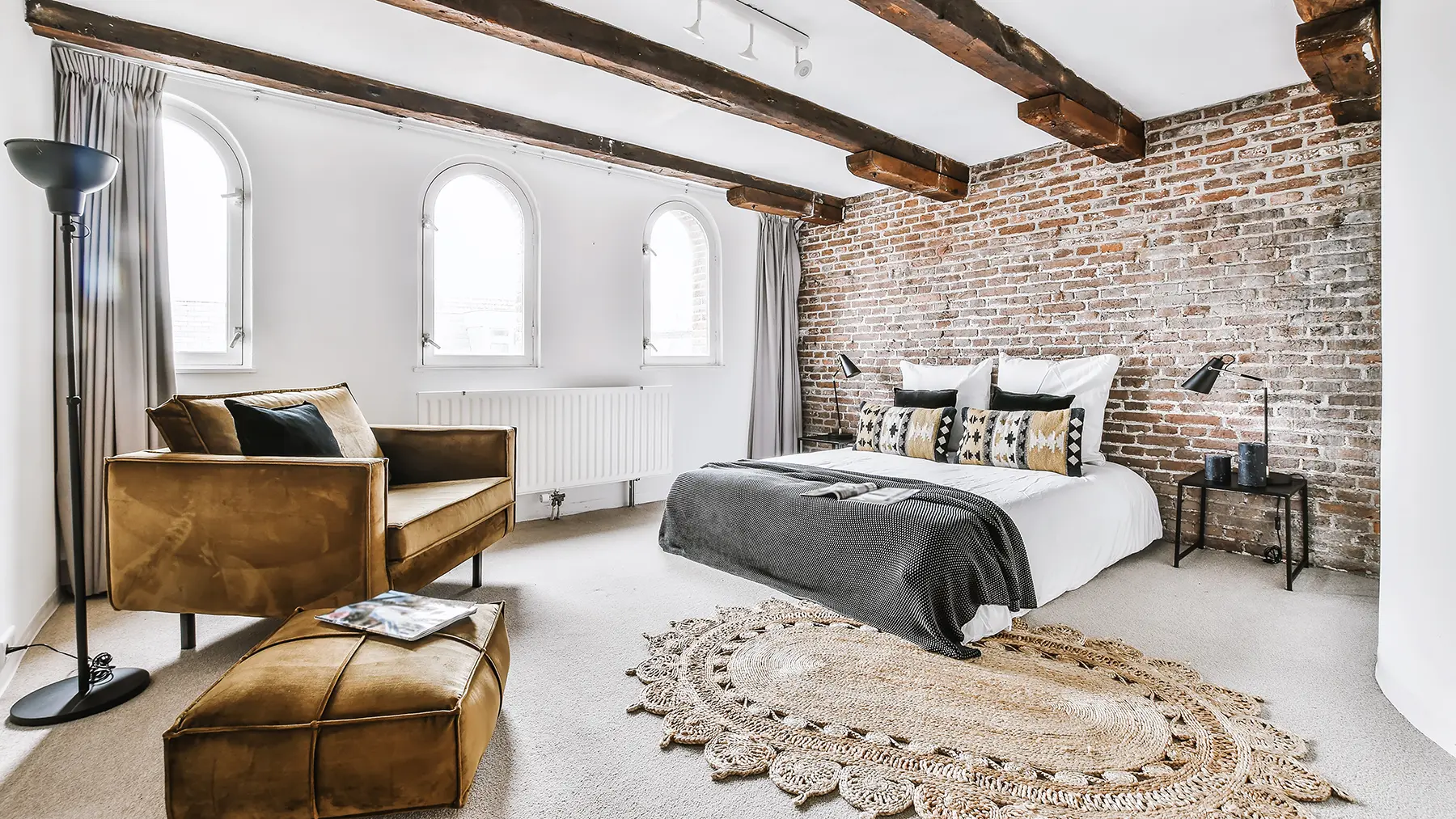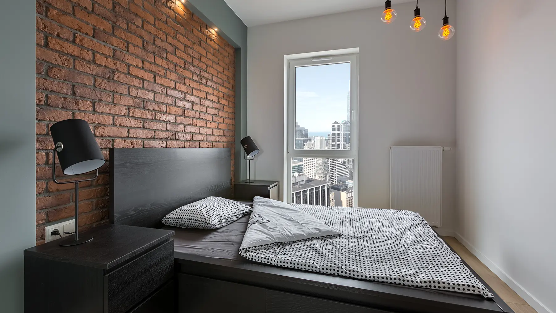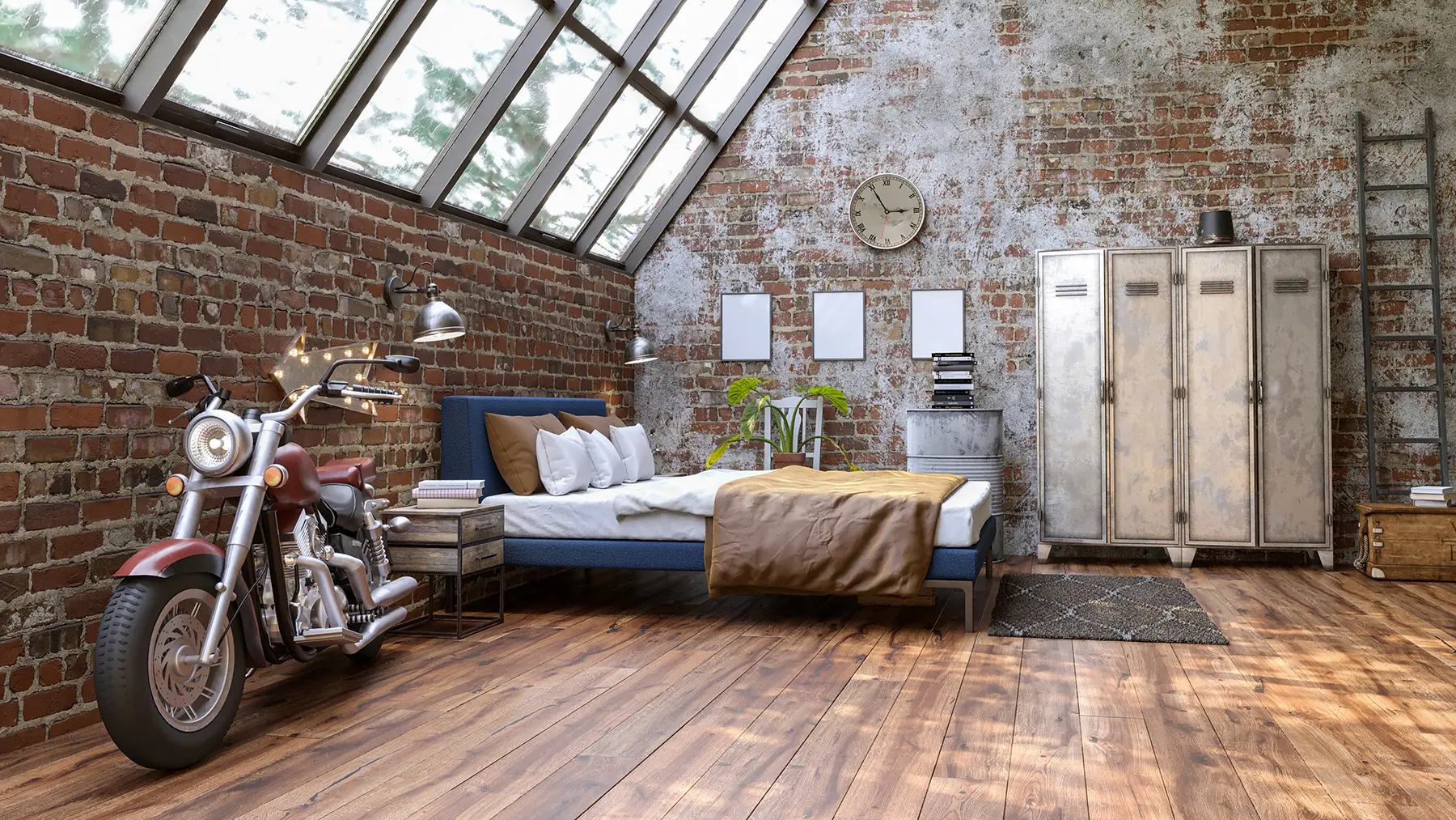 Лучше всего реализовывать стиль в больших помещениях с высокими потолками и панорамными окнами. Однако и в небольшой спальне можно использовать его отдельные элементы. Например, оформить одну из стен под кирпичную кладку, поставить кровать с кожаным изголовьем или мебель с элементами из дерева или металла, а для освещения развесить лампочки Эдисона.