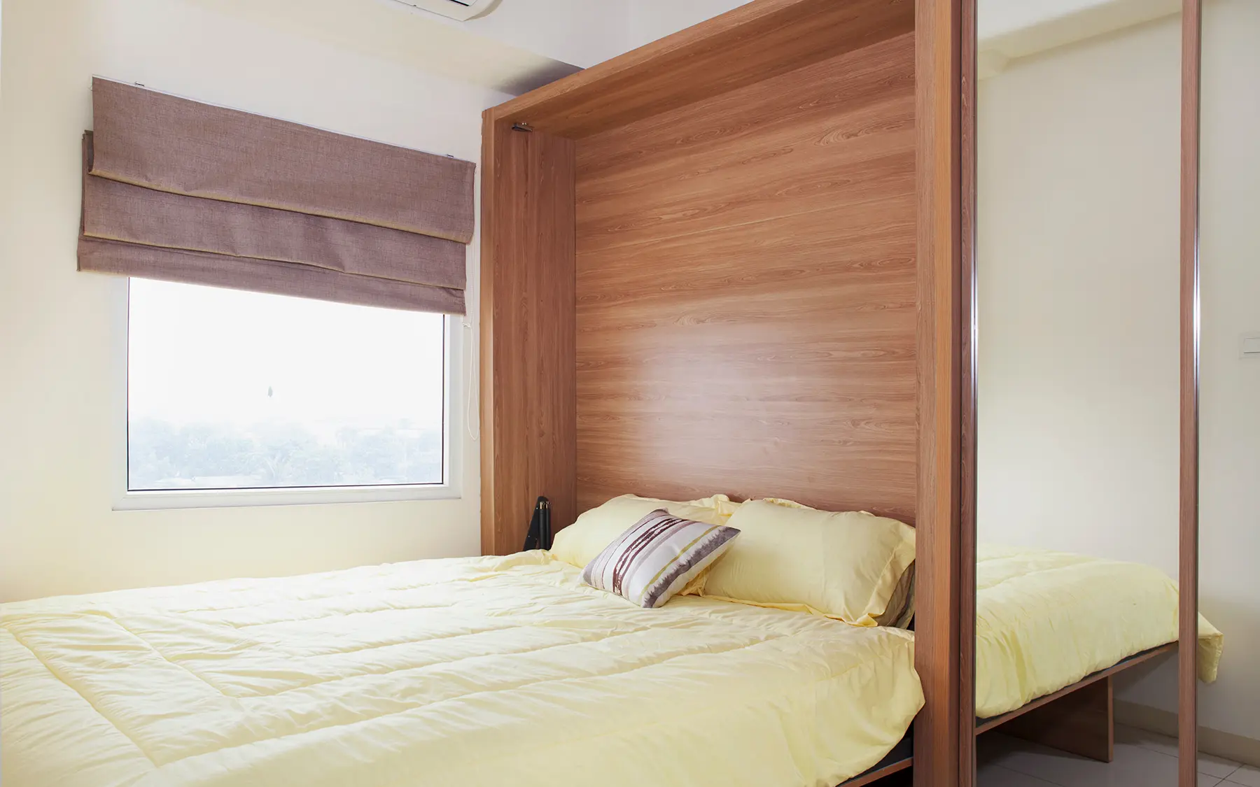 При оформлении маленькой комнаты используйте решения, которые позволят максимально освободить пространство. Откажитесь от лишней мебели и декора, рационально используйте стеновые ниши, углы и подоконники. Если в квартире достаточно мест для хранения вещей, не ставьте в спальню шкаф. А если он все-таки нужен, приобретите модель до потолка: высокий фасад визуально поднимет стены, а на верхних полках вы сможете хранить редко используемые вещи. Прикроватные тумбочки замените на полки и настенные светильники. Или установите компактные подвесные модели.