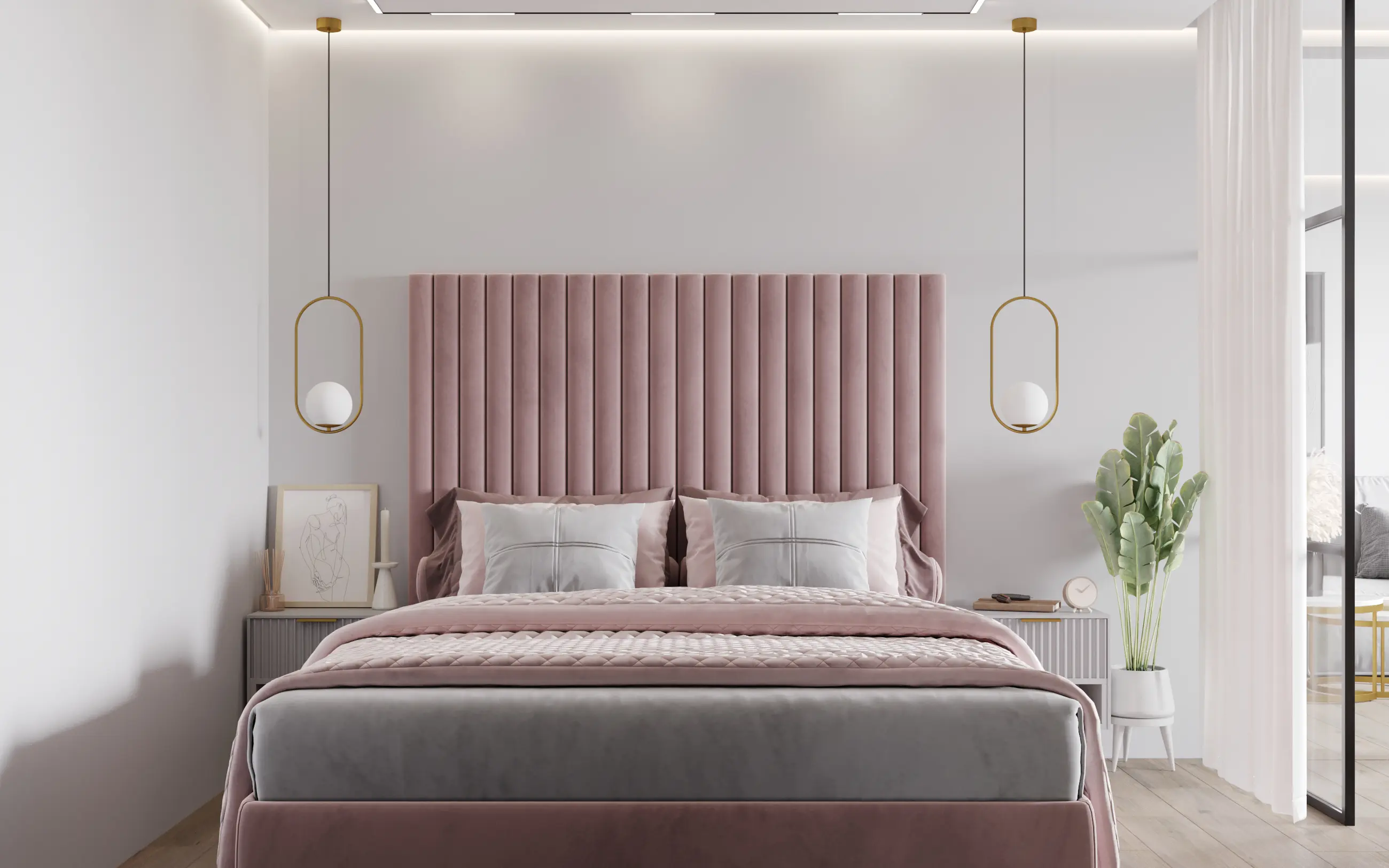 В прикроватной зоне актуальны низко висящие потолочные светильники, например одиночные, парные или каскадные подвесы.