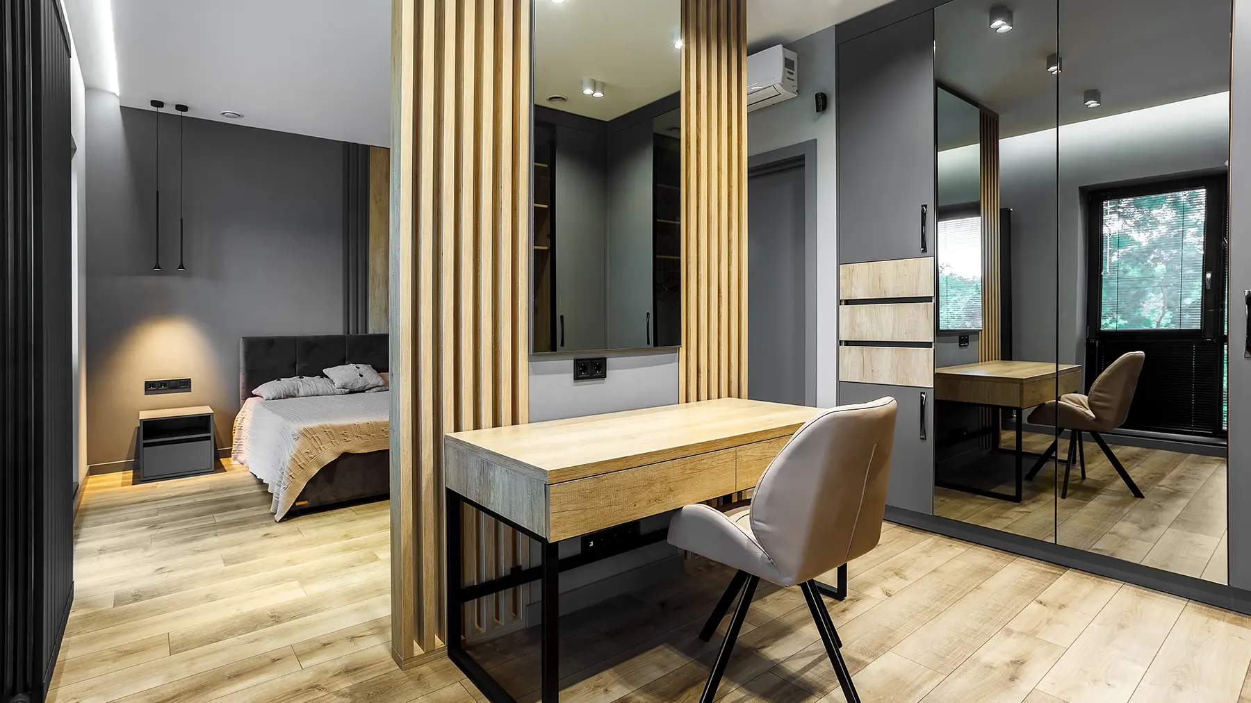 Если позволяет площадь, выделите в спальне дополнительные зоны. Можно организовать рабочее место с компактным компьютерным столом и эргономичным креслом. Разместить эту зону можно у окна — здесь хорошее естественное освещение. Или в стеновой нише. Обособить рабочее место можно с помощью ширмы или перегородки.