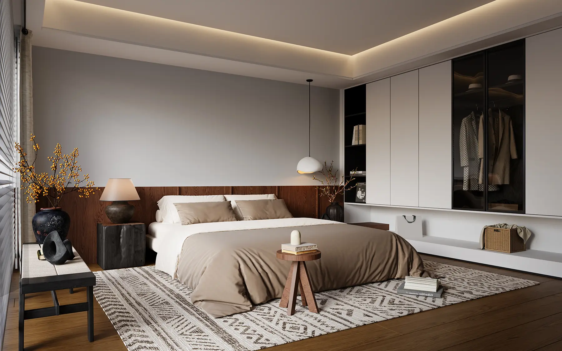 Черты стиля — простор, много света, простая отделка и умеренность в декоре. Приветствуется индивидуальность: сюда отлично впишутся дизайнерская мебель, креативные светильники и вазы, произведения искусства. Центральное место отводится кровати. Это может быть очень широкая или заниженная модель.