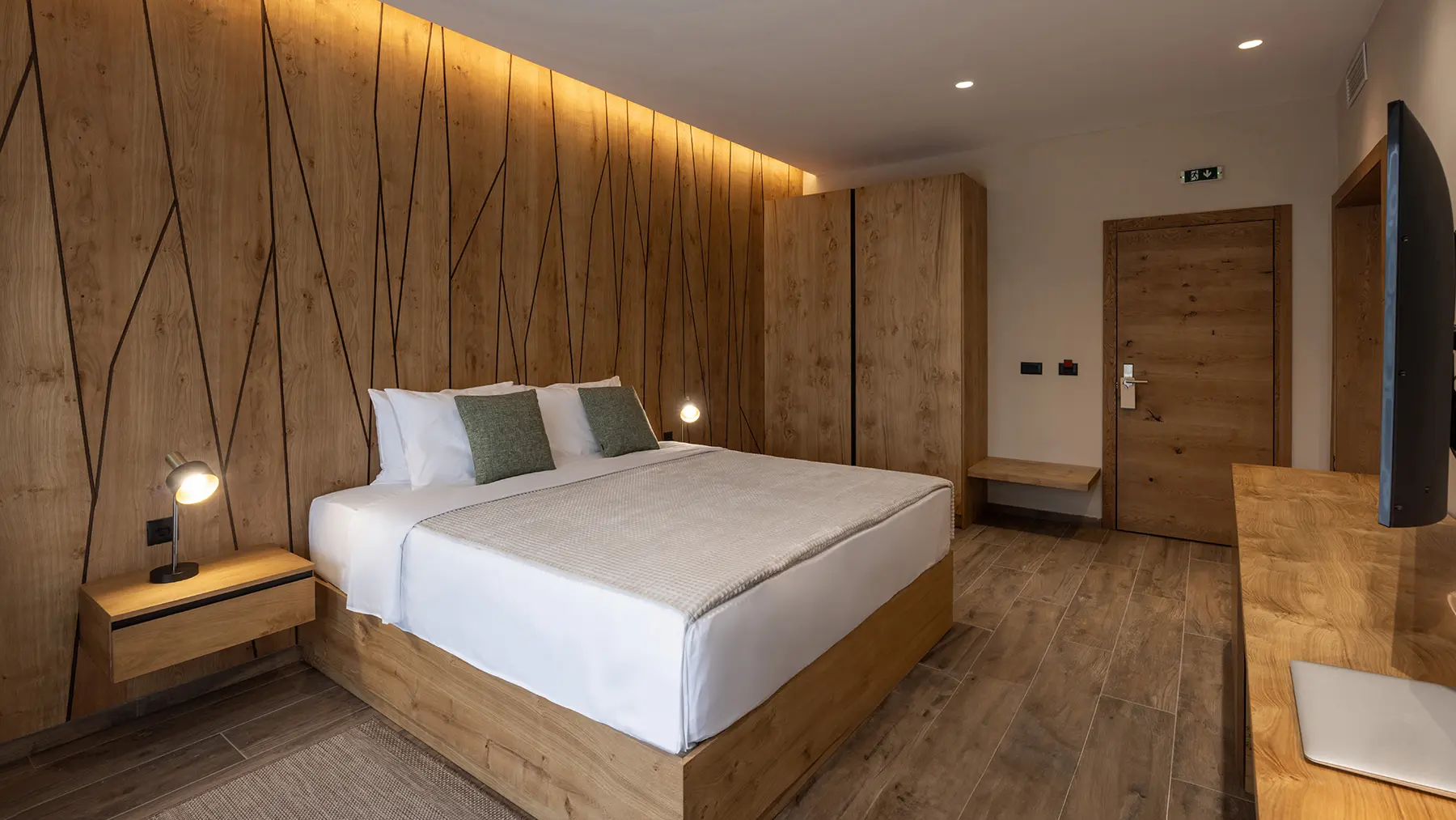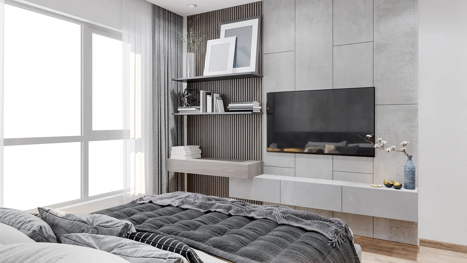 Поскольку телевизор не сочетается с расслабленной обстановкой спальни, не ставьте на нем акцент, а постарайтесь сделать незаметным. В тренде — растворять его в отделке или мебели. Например, телевизор будет менее заметным на фоне темных деревянных реек, панелей или искусственного камня.