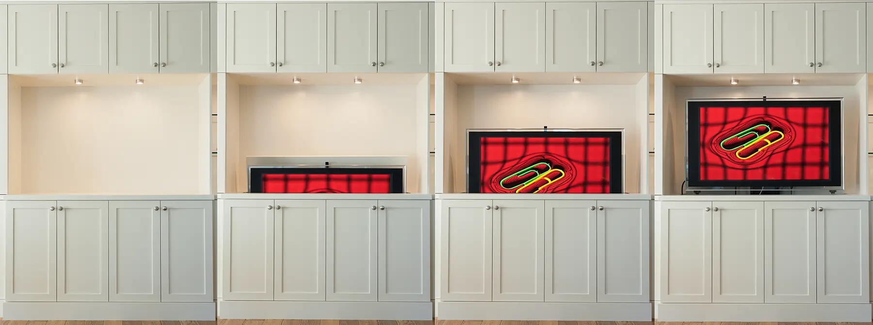 Более технологичное решение — ТВ-лифт. С помощью встраиваемого механизма телевизор можно спрятать в тумбу, шкаф или даже потолок.