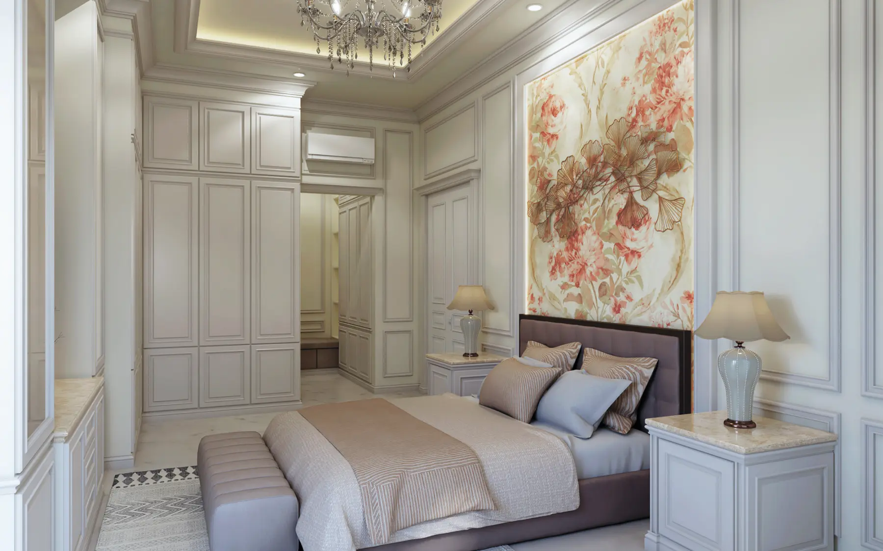 В тренде броское оформление стены за изголовьем. Вариантов декорирования очень много: от оформления в контрастном цвете и нанесения крупного принта до необычной отделки молдингами, фресками и 3D-панелями с подсветкой.
