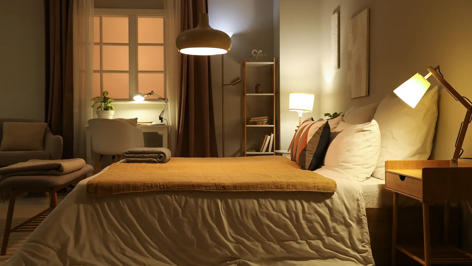 В спальне как нигде уместны светильники с возможностью управления освещением. Установите диммер на люстру и регулируйте поток света так, как вам этого хочется.