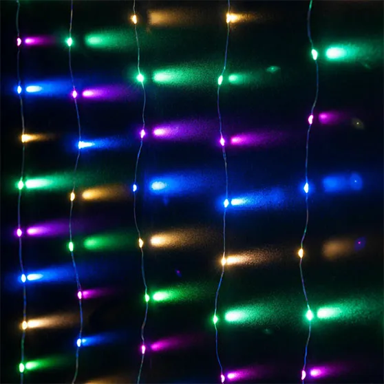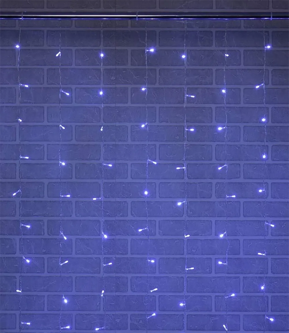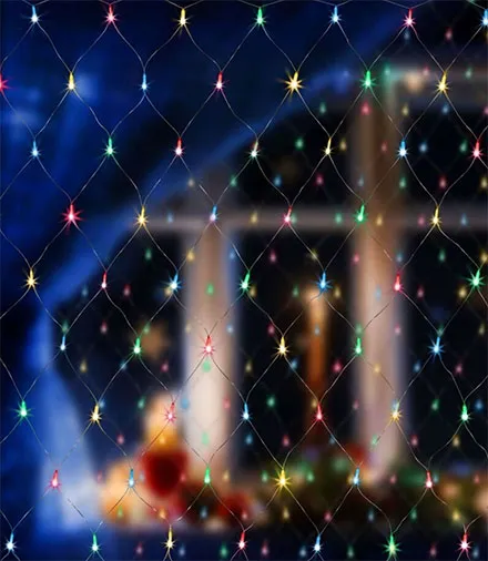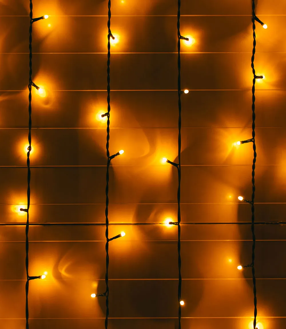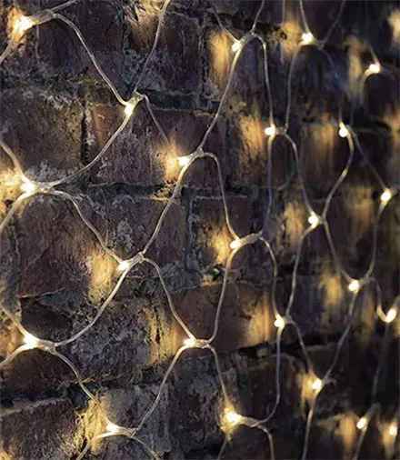 Если вы хотите осветить окно, стену или потолок, еще один хороший вариант — электрогирлянда «сеть». Она состоит из переплетающихся светодиодных проводов, которые образуют ячейки. В итоге получается крупная сетка из световых точек на равном расстоянии.