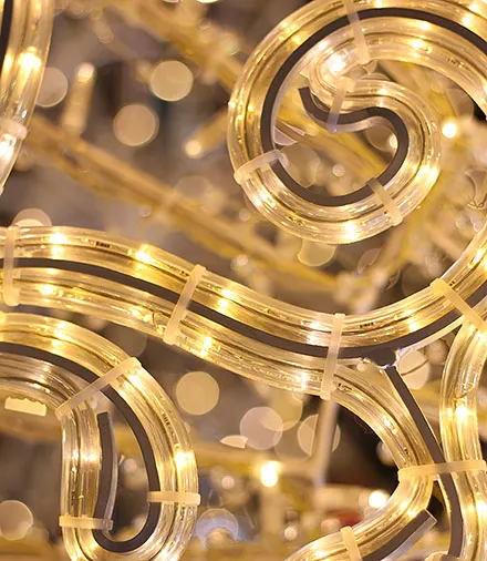 В модели «дюралайт» нити из светодиодов продеты в прозрачные ПВХ-шнуры. Это не привычный вид новогодней гирлянды с отдельными лампочками — ее используют для создания декоративных световых композиций в помещении и на улице. Шнуры бывают круглыми или плоскими, диоды внутри — белыми, желтыми или разноцветными.