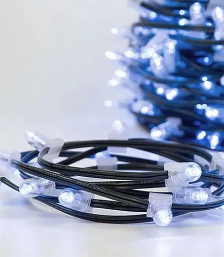 В этой разновидности гирлянды светодиоды расположены внутри специальных гнезд, которые на равном расстоянии закреплены прямо на шнуре. Гибкий провод позволяет сформировать фигуру или, например, обернуть гирлянду вокруг перил, колонны.