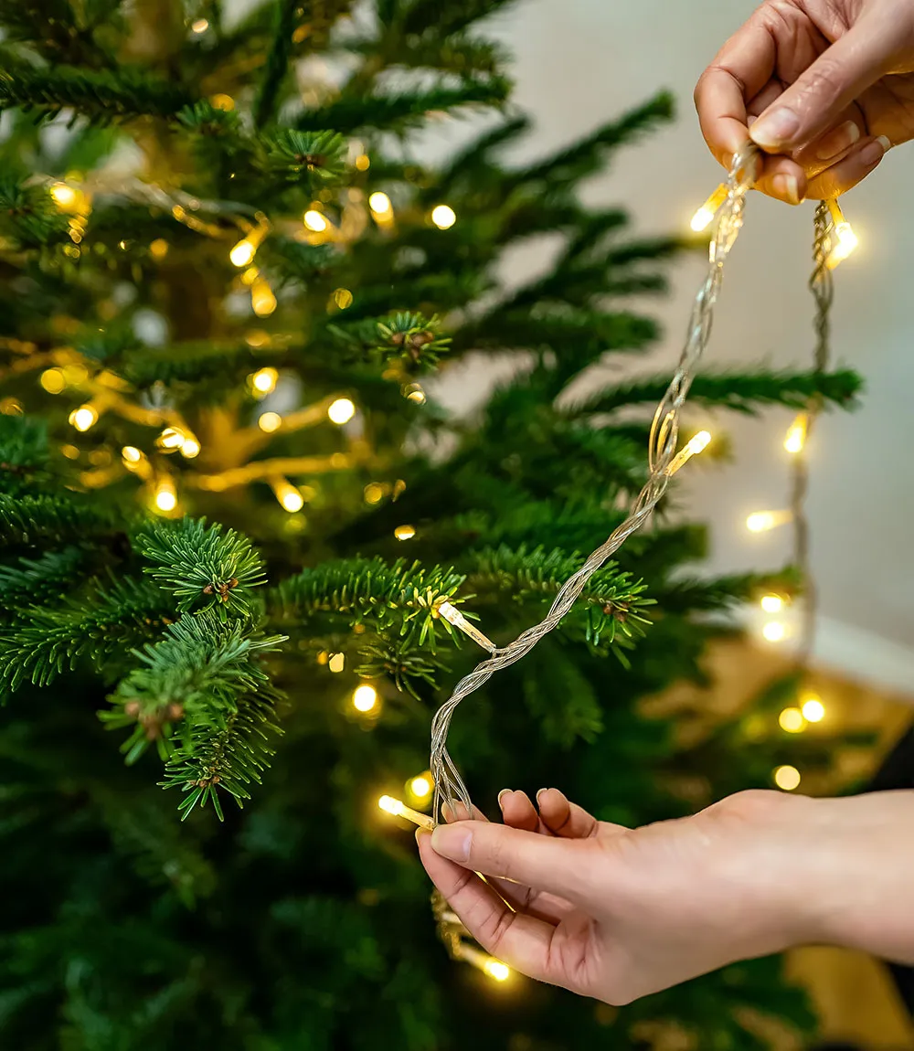 - Последний участок гирлянды спрячьте за ствол или выведите к источнику питания.