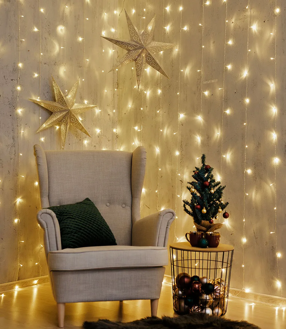 Гирлянды-занавесы хорошо подходят для окон. Крепите их к карнизу или на специальные прозрачные клипсы для стекла. Следите, чтобы светящееся полотно закрывало окно полностью ― это создаст атмосферную иллюминацию как внутри, так и снаружи. Для большего эффекта используйте струящиеся полупрозрачные тюли, а не плотные тяжелые шторы.