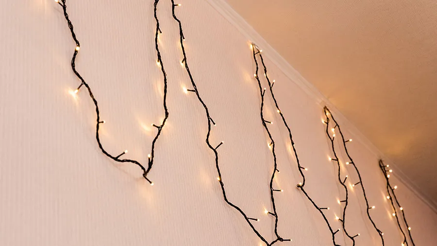 «Бахрому» можно повесить в верхней части стены, чтобы декорировать пространство под потолком. Есть модели с разным типом свечения. Для создания спокойной уютной обстановки выбирайте теплый бело-желтый свет.