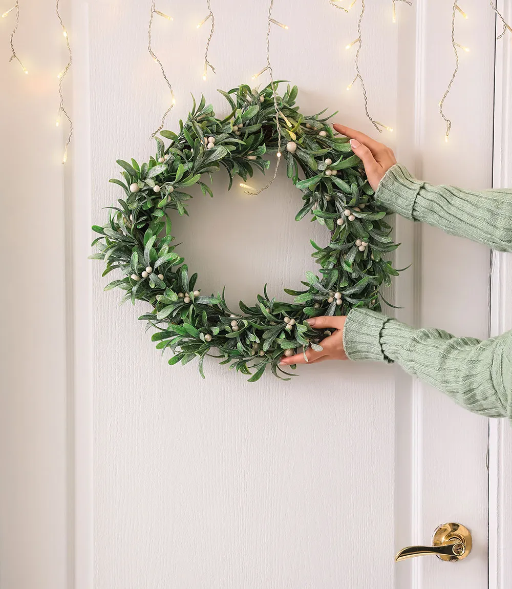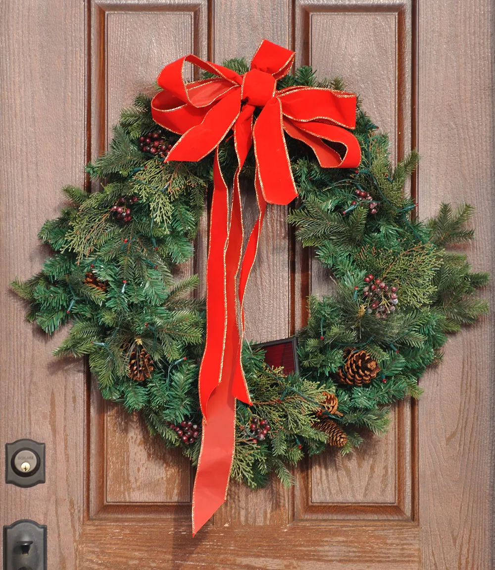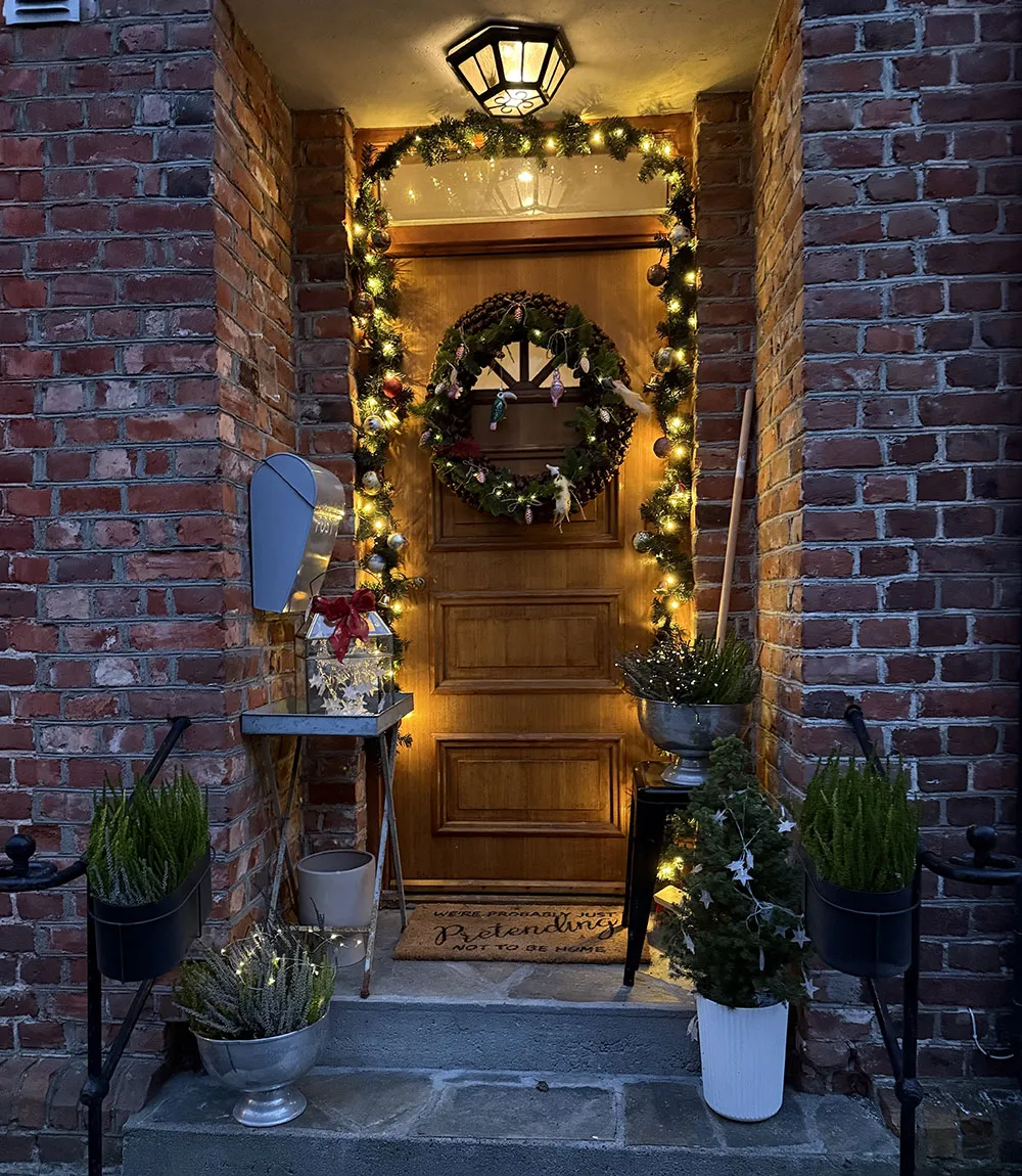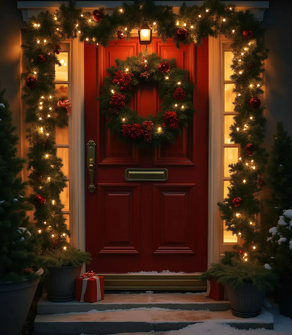 К светящемуся декору можно добавить и другие украшения: еловые лапы, шишки, колокольчики. Если это входная дверь, повесьте в центр рождественский венок или крупный бант.