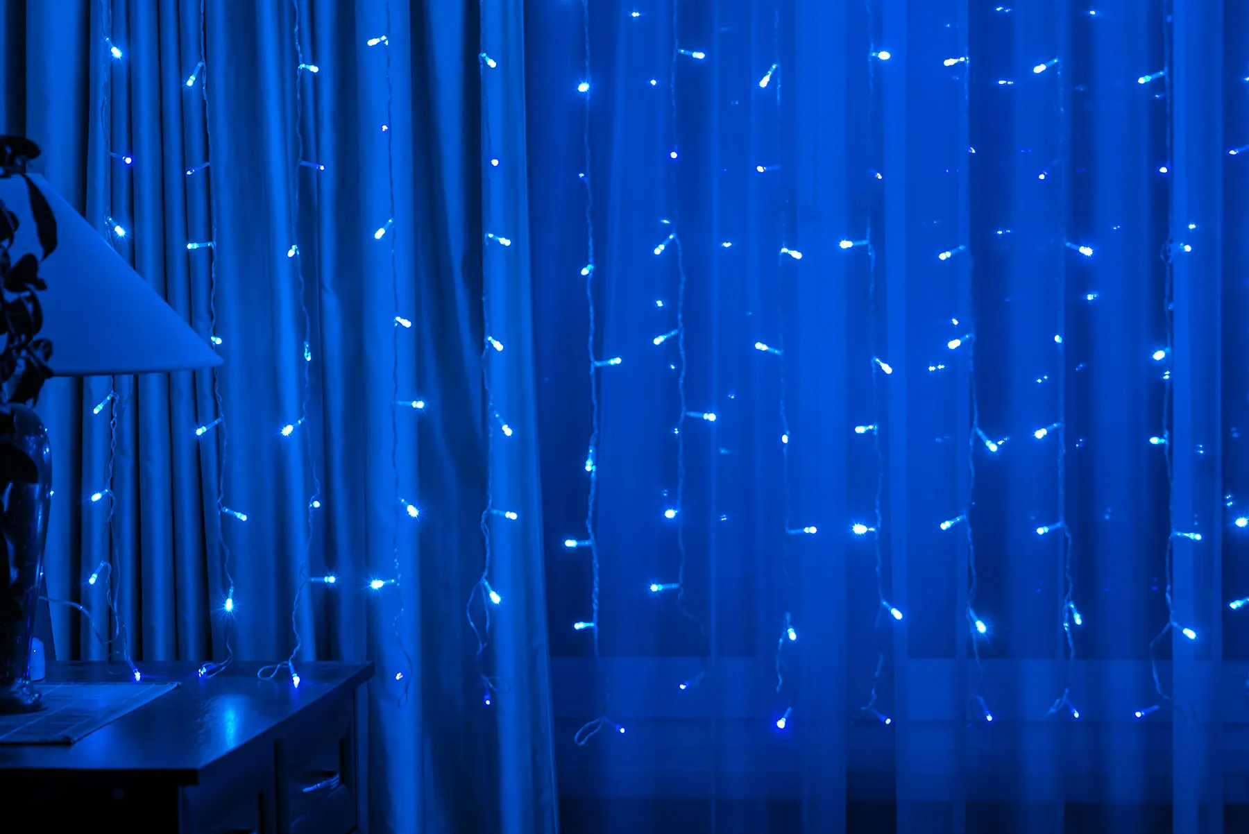 Холодное свечение — яркое, притягивающее взгляд. Его используют на витринах магазинов и в общественных местах. Подойдет для украшения загородного дома снаружи и сада: в окружении снега такие гирлянды будут особенно эффектны. В квартире яркий голубоватый свет лучше не использовать — в крайнем случае в просторной гостиной-столовой с большими окнами, например для украшения штор.