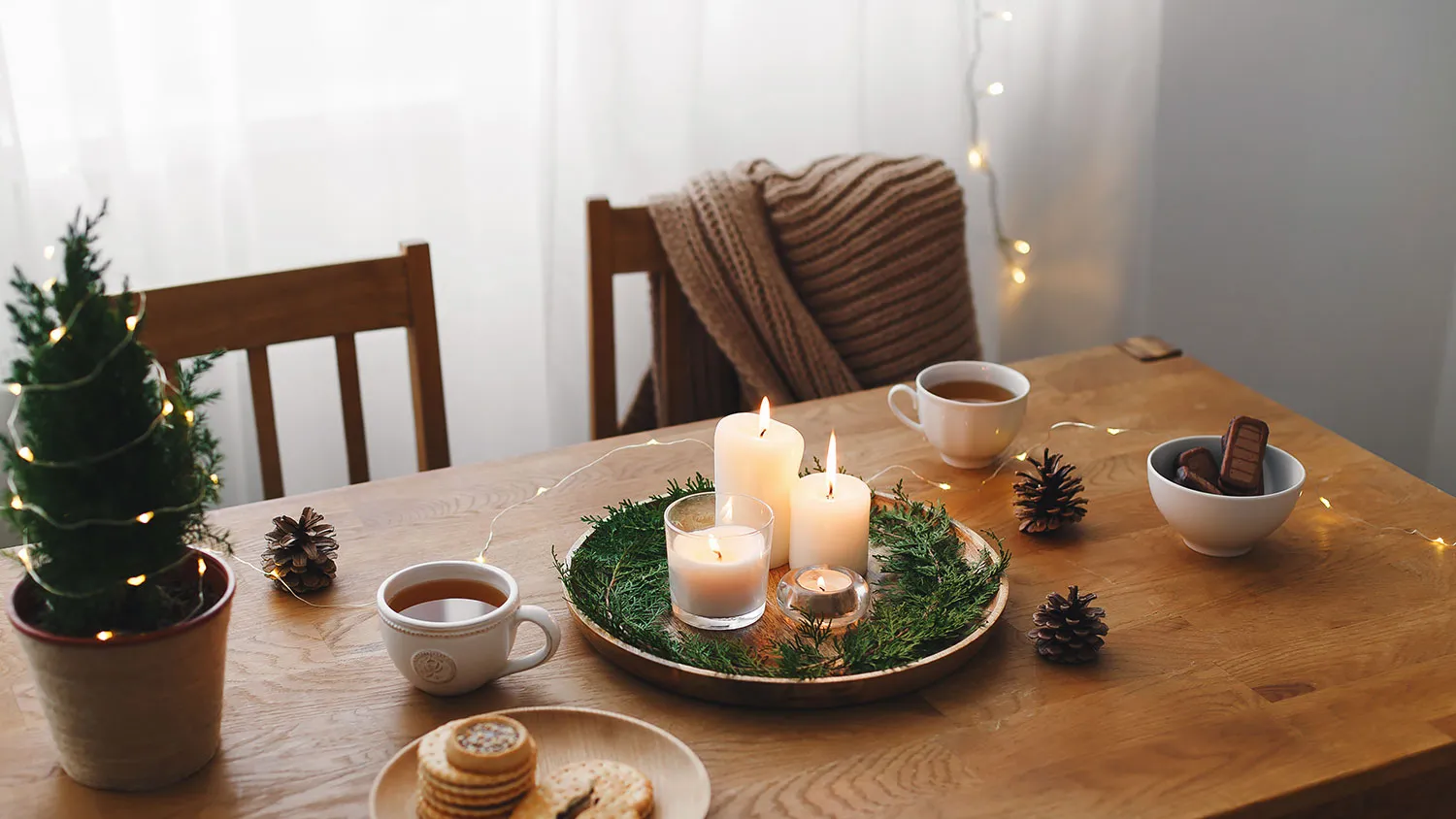 Если украшаете обеденный стол, дополните гирляндой центральную композицию. В данном случае предпочтительнее модель на батарейках, чтобы провод не тянулся со столешницы и не мешал во время еды.