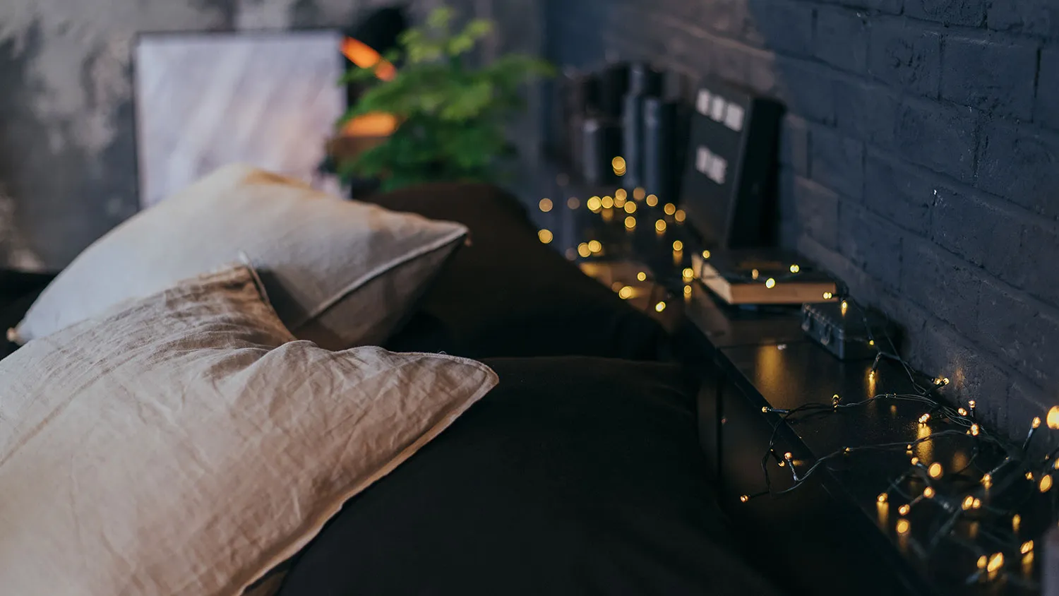 Идея для спальни ― оформить гирляндой изголовье кровати. Подойдет модель с мелкими однотонными светодиодами, которые не будут мешать отдыху. Кованый каркас просто обмотайте, а для цельного используйте скотч или прозрачные крючки на липучках. Либо подвесьте гирлянду на стене над ним.