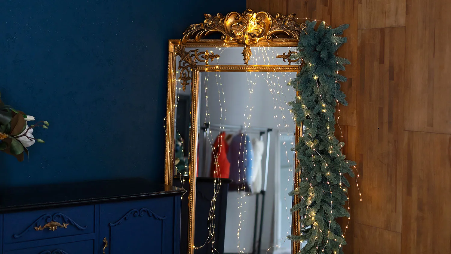 Такое оформление создает интимную, расслабляющую атмосферу, особенно если выбрать изделие с регулировкой яркости. Также можно пустить светящуюся нить по периметру настенного или напольного зеркала ― получится стильно и по-праздничному ярко за счет отражения.