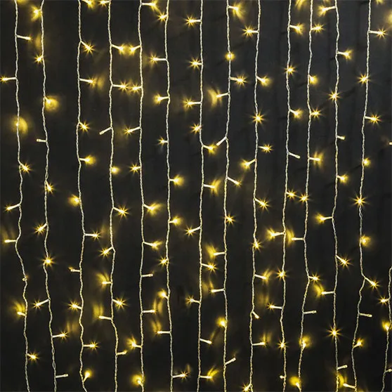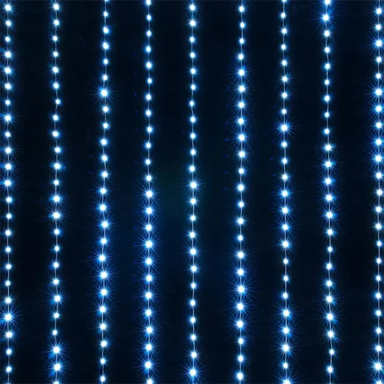 У «занавеса» от основного кабеля вниз идут нити одинаковой длины. Они создают эффект единого светящегося полотна. По формату эта модель напоминает «сеть», но плотность диодов выше.