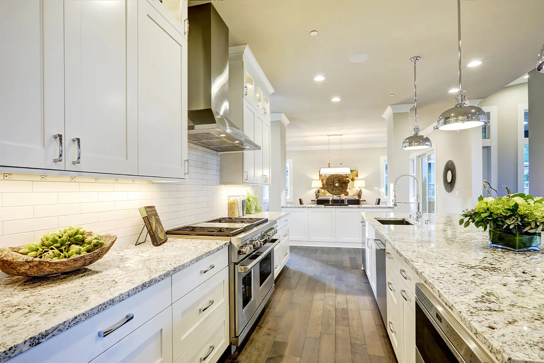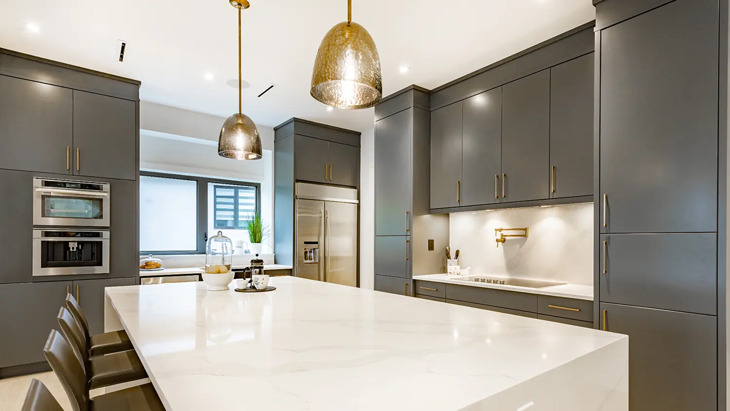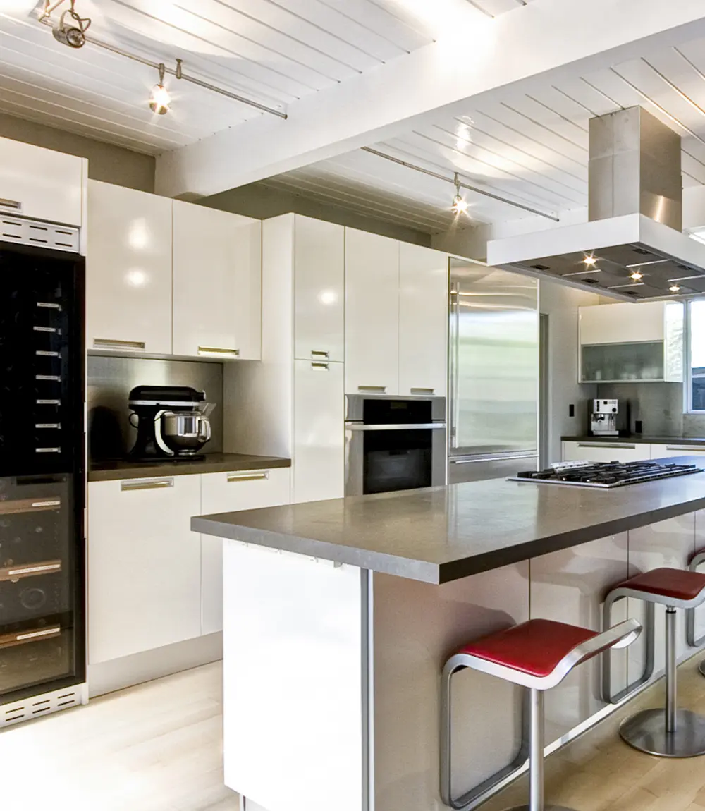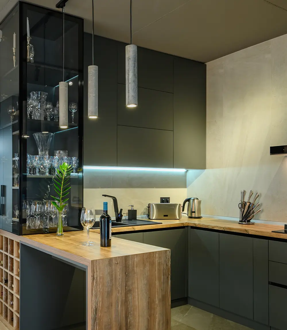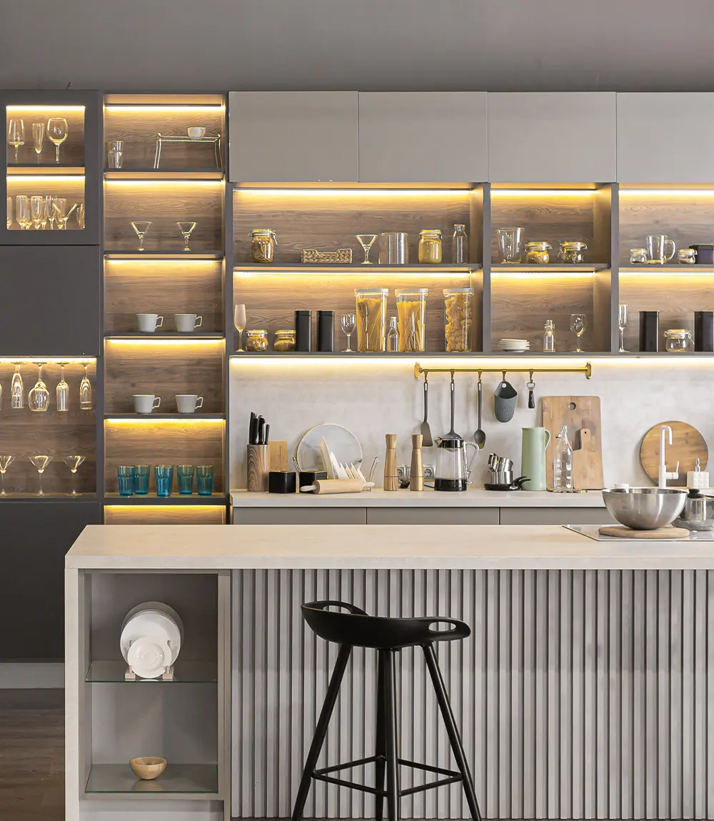 Вместе с этим в кухне можно организовать и различные сценарии освещения — для этого делают верхнюю и нижнюю подсветку зоны приготовления пищи, то есть свет по верхнему и по нижнему краю кухонного гарнитура. Если есть барная стойка, зона отдыха или красивые дизайнерские элементы — подсвечивают и их.