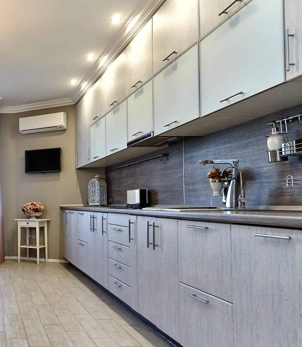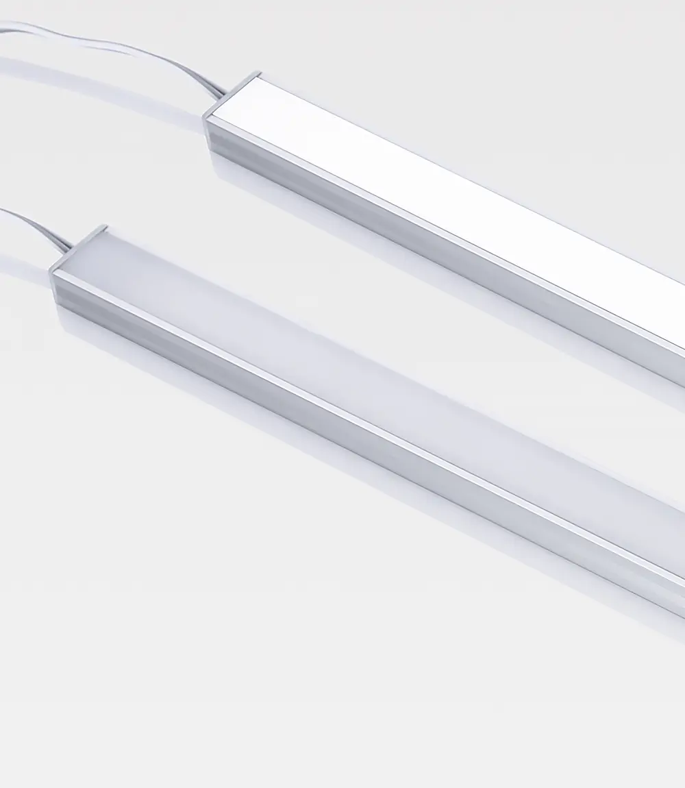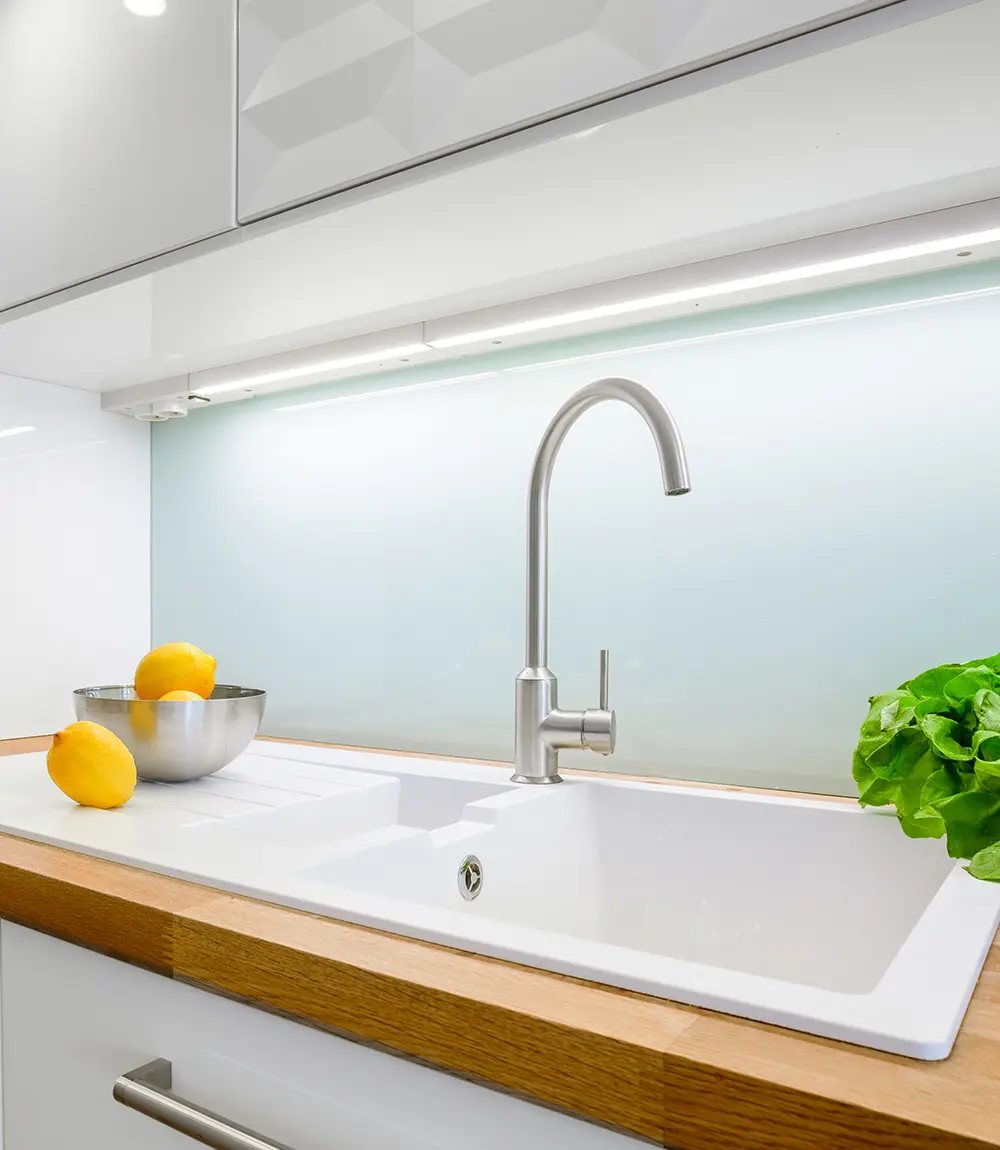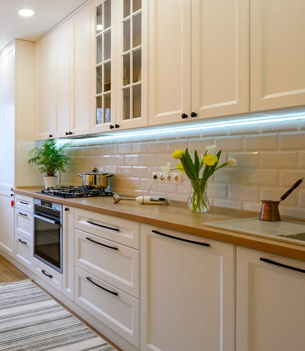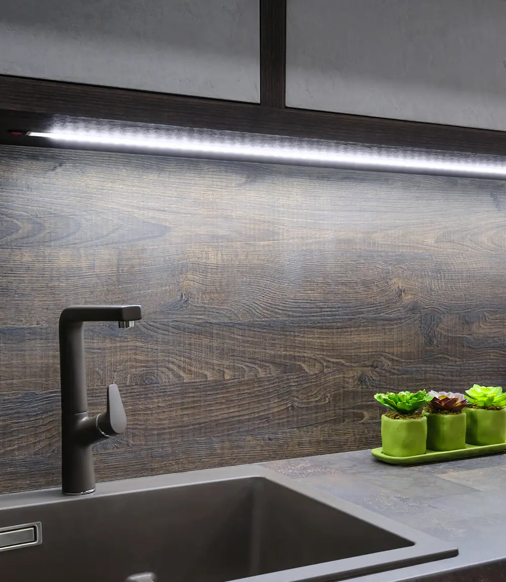 Эффектное современное решение — линейные светильники. Их легко монтировать — нужно прикрутить на саморезы к нижней крышке подвесных шкафов.