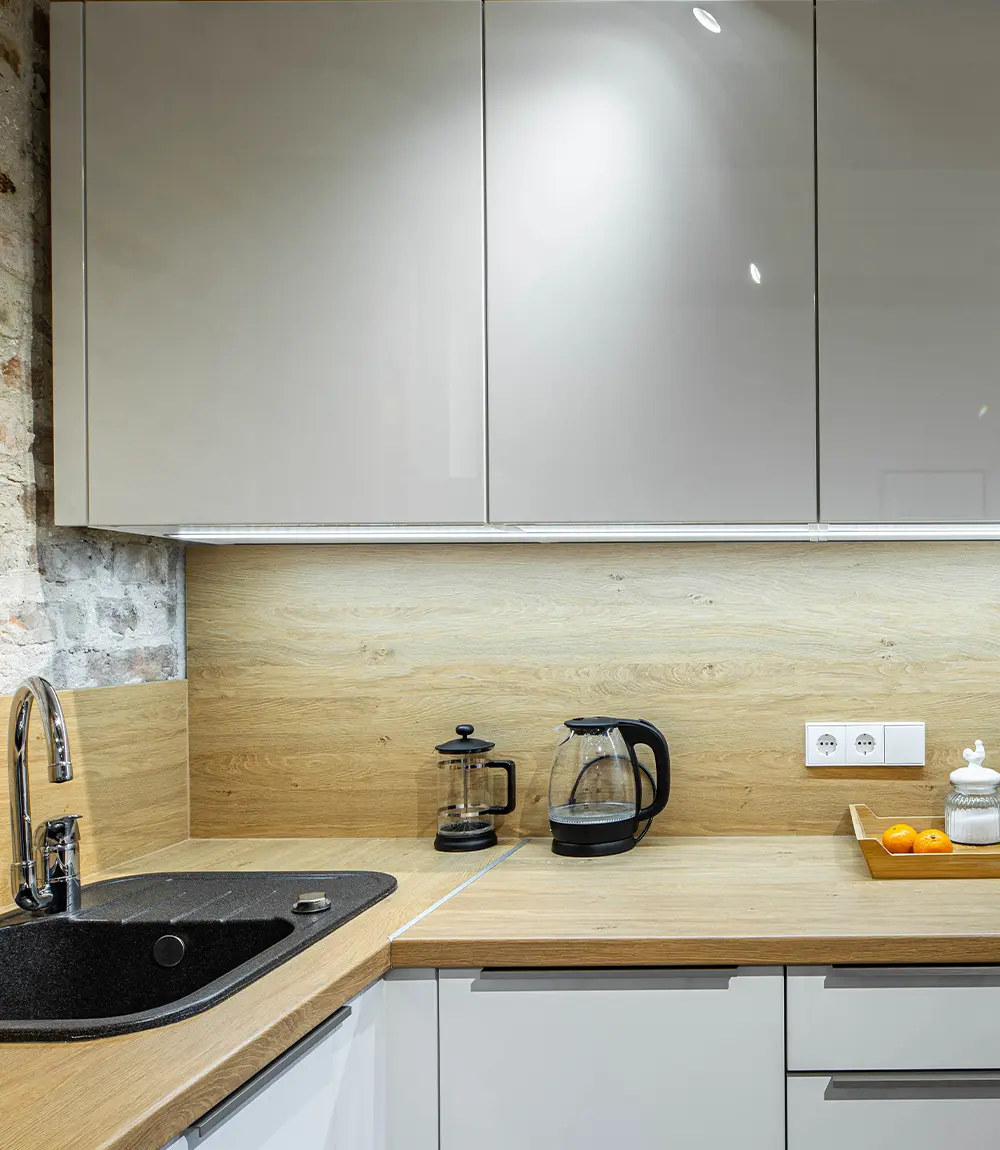 Простой и бюджетный способ подсветить столешницу ― светодиодная лента. Ее размещают либо на подвесном шкафу, либо над фартуком. Это нужно делать на стадии чистовой отделки, чтобы понимать, где будет трансформатор, а где ― выключатель для подсветки.