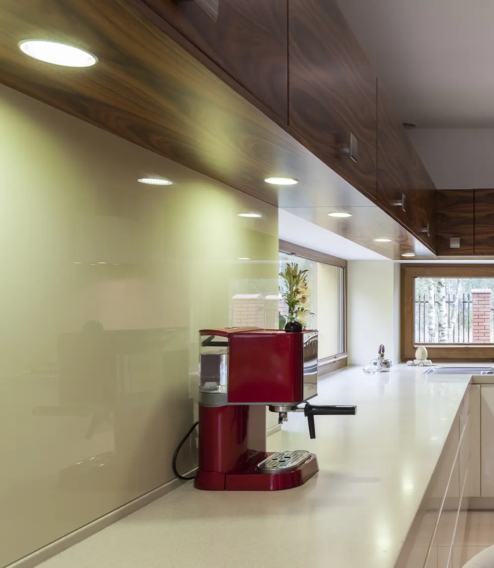 Второй вариант ― точечные светильники. Их врезают в нижнюю панель подвесных шкафов на стадии сборки кухонного гарнитура. Это традиционный вариант подсветки, особенно гармонично он смотрится в сочетании с классическим кухонным гарнитуром. Недостаток таких светильников в том, что они «крадут» место внутри шкафов.