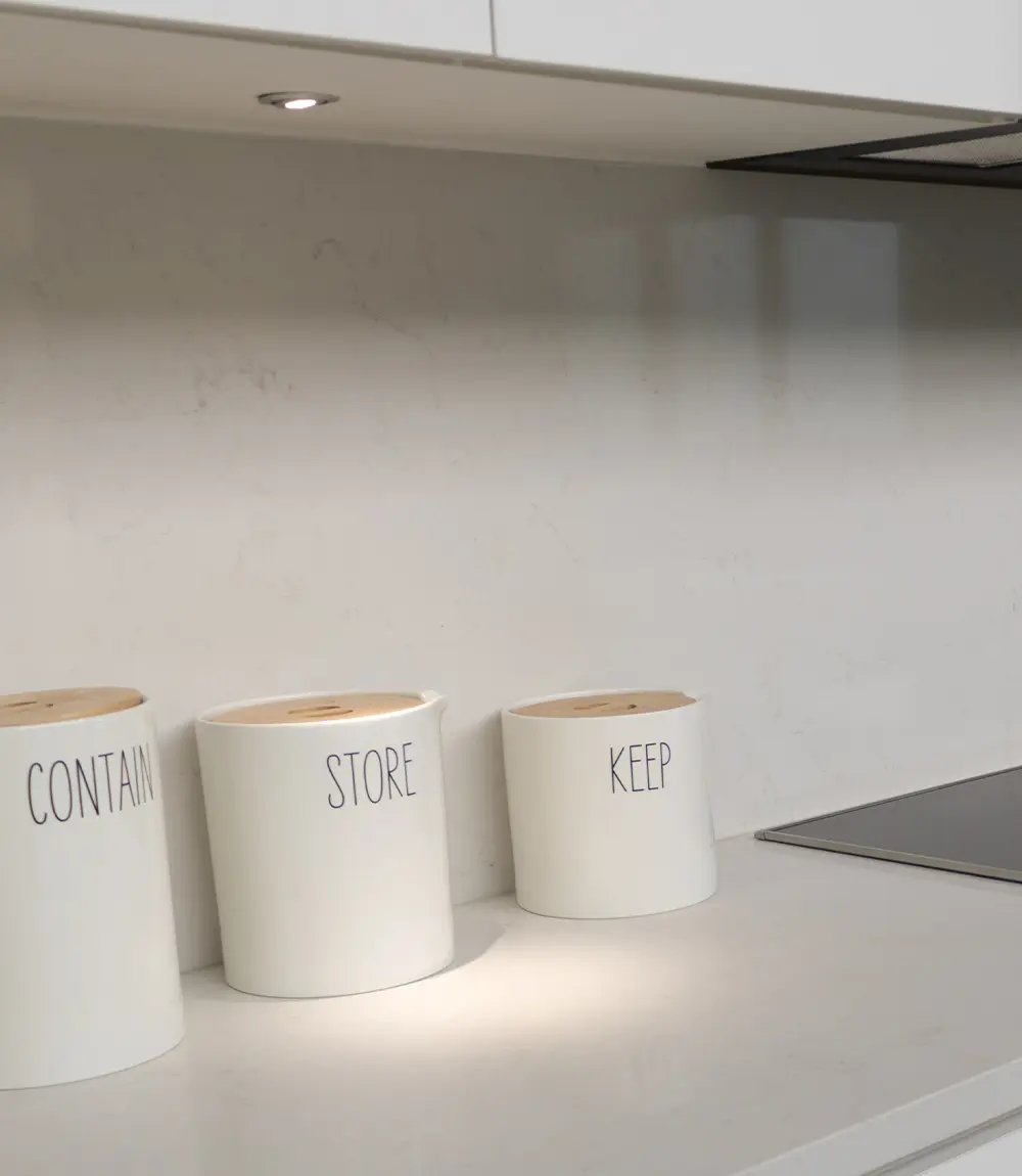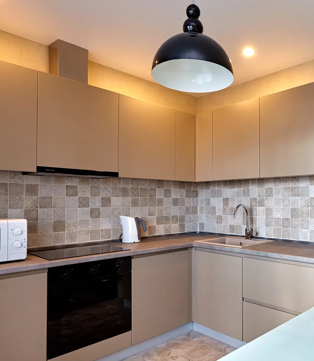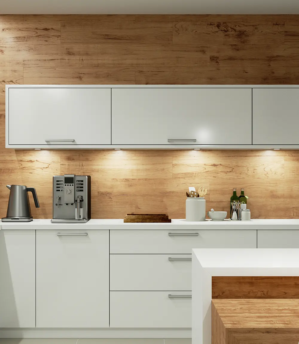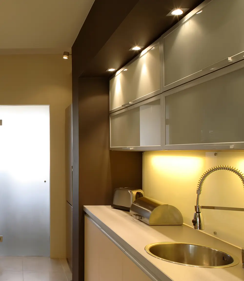 Для верхнего освещения возьмите чуть более теплый свет, чем для столешницы — около 3 000 К. Желательно, чтобы его температура совпадала с температурой света в других зонах кухни и в смежных с ней пространствах — человеческий глаз плохо воспринимает переход от одной световой температуры к другой.