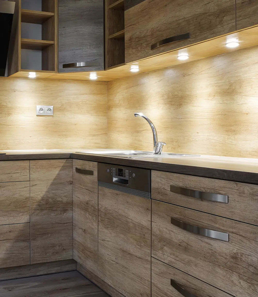 Если вы хотите поместить источники света в кухонный гарнитур, то на стадии черновой отделки нужно вывести электропровод на ту стену, где будут располагаться шкафы. При монтаже мебели к нему подключают все необходимые светильники.