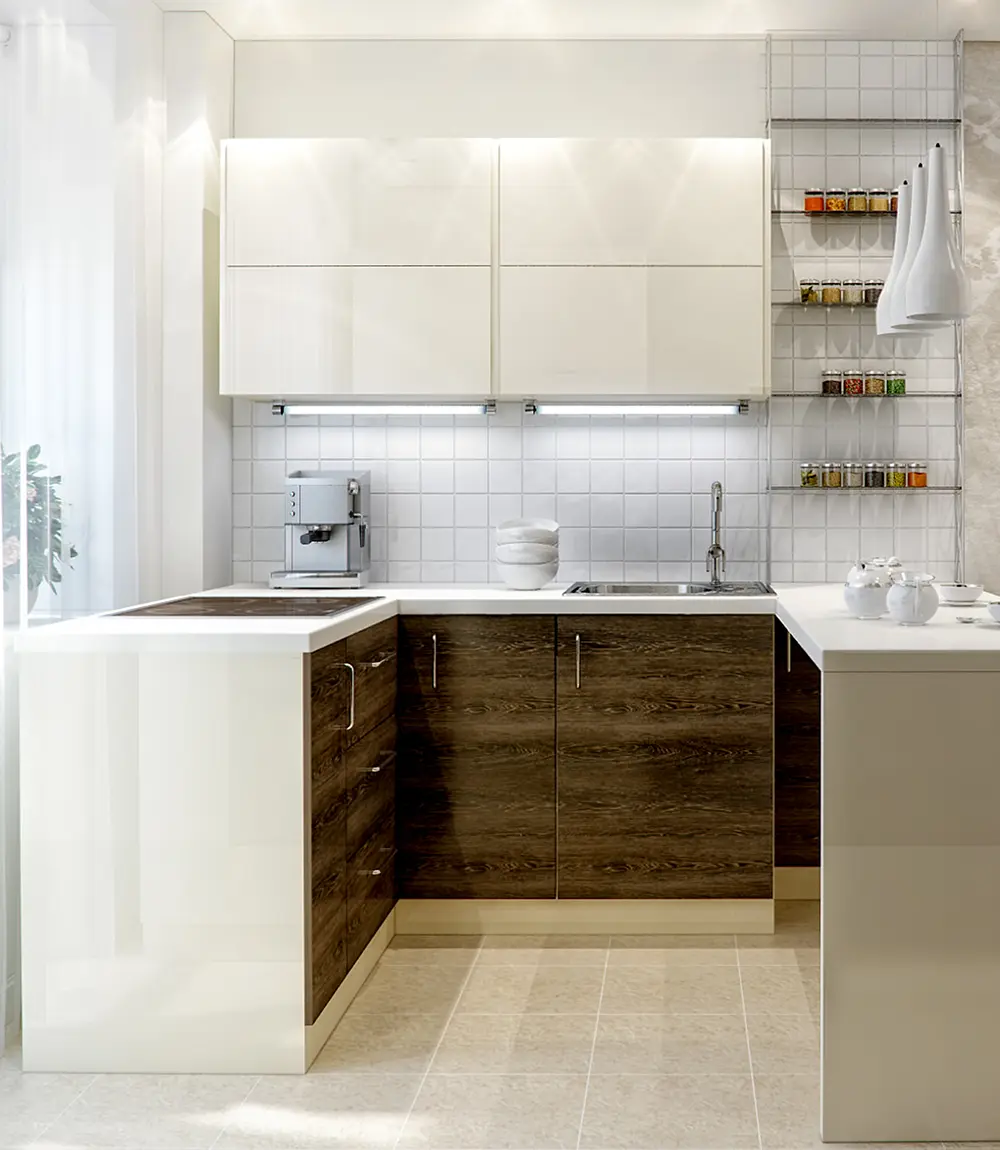 Для верхнего освещения зоны приготовления пищи используют встраиваемые светильники, например круглые галогеновые лампы. Если у верхних шкафов есть карниз, то лампы монтируют в него. Если карниза нет, то можно врезать светильники в потолок или повесить на него споты — по линии верхних подвесных шкафов.