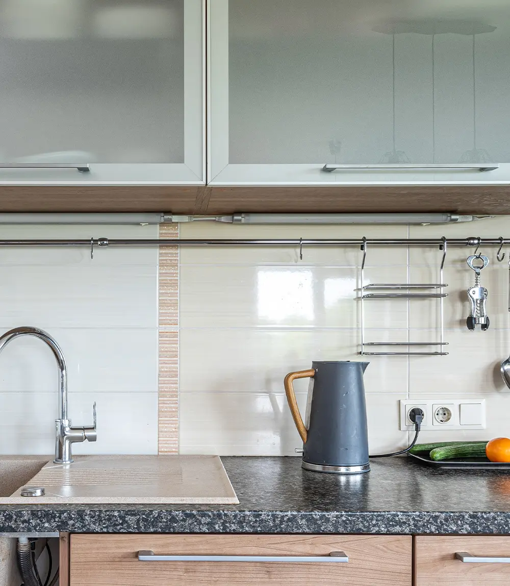 Локальный свет, направленный на столешницу, не освещает пол, — передвигаться в полутьме некомфортно и небезопасно. Поэтому нужен еще и верхний свет — чтобы освещал всю зону приготовления пищи, а не только столешницу. Для этого подсветите кухонный гарнитур сверху.