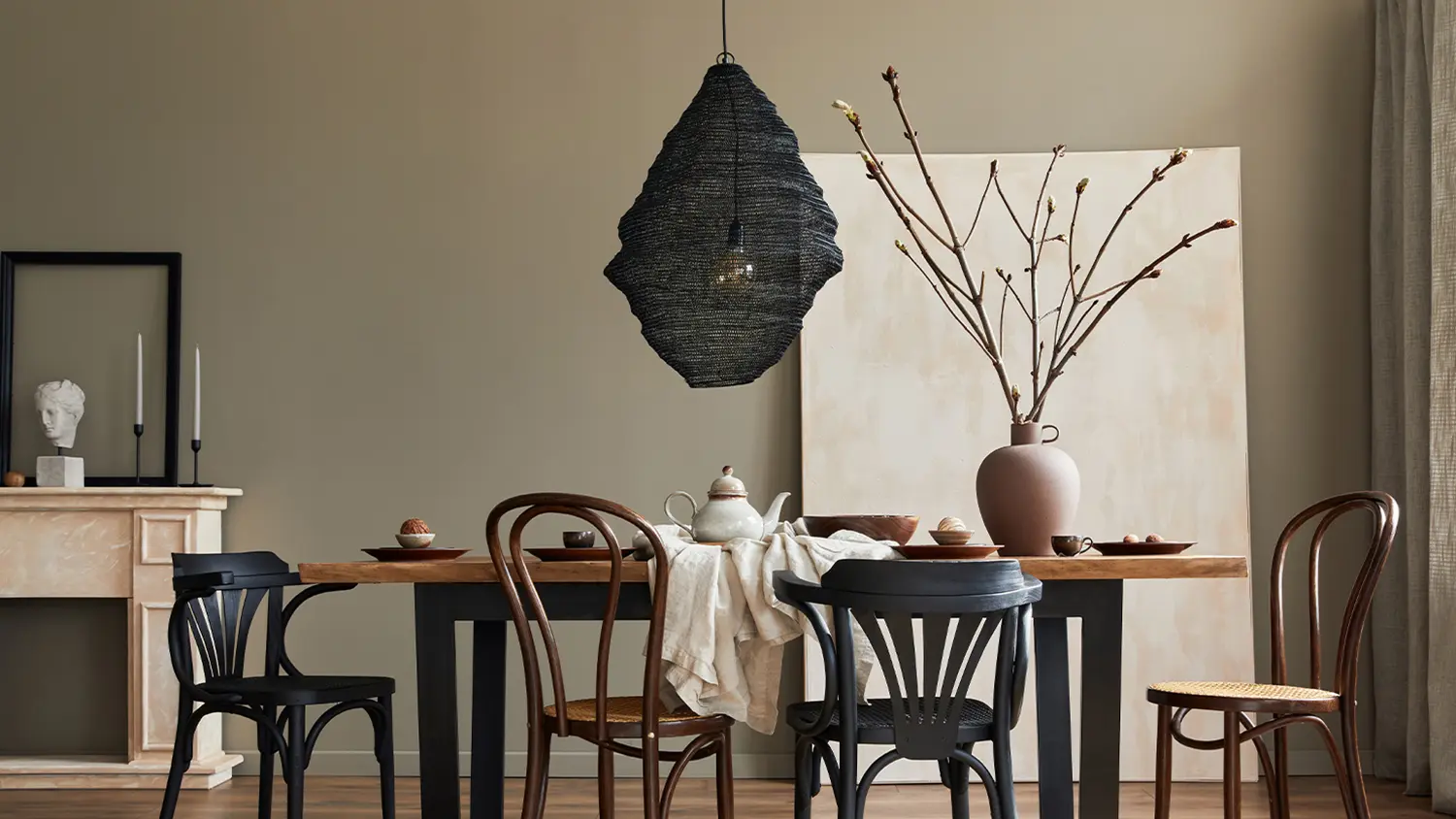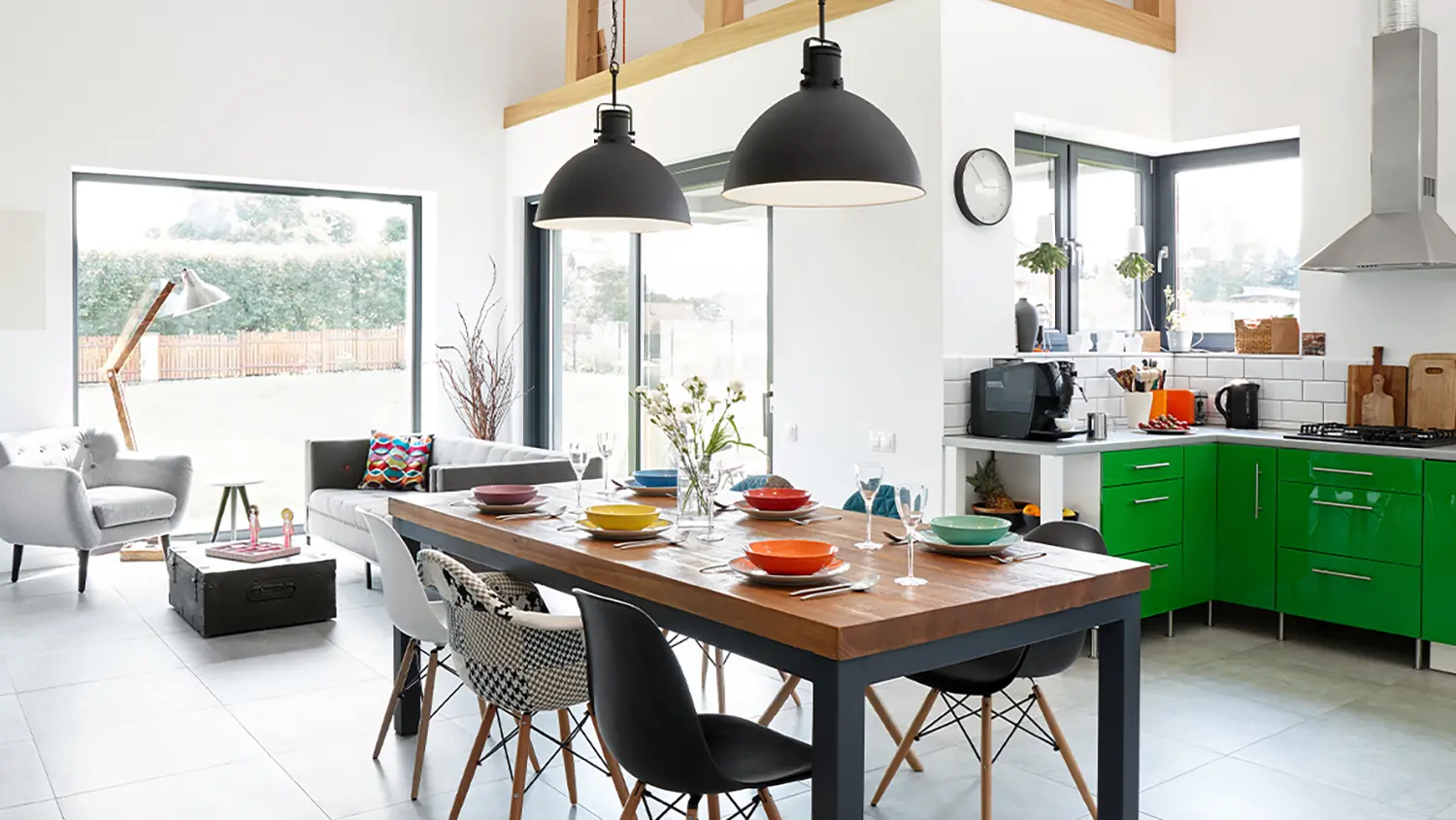 Обеденную зону обычно выделяют подвесными светильниками ― одним большим, например люстрой, или несколькими поменьше. Их свет должен быть не рассеянным, а направленным прямо на стол.