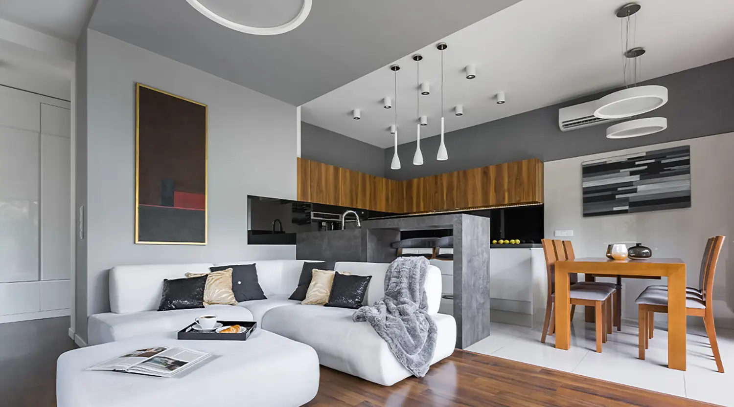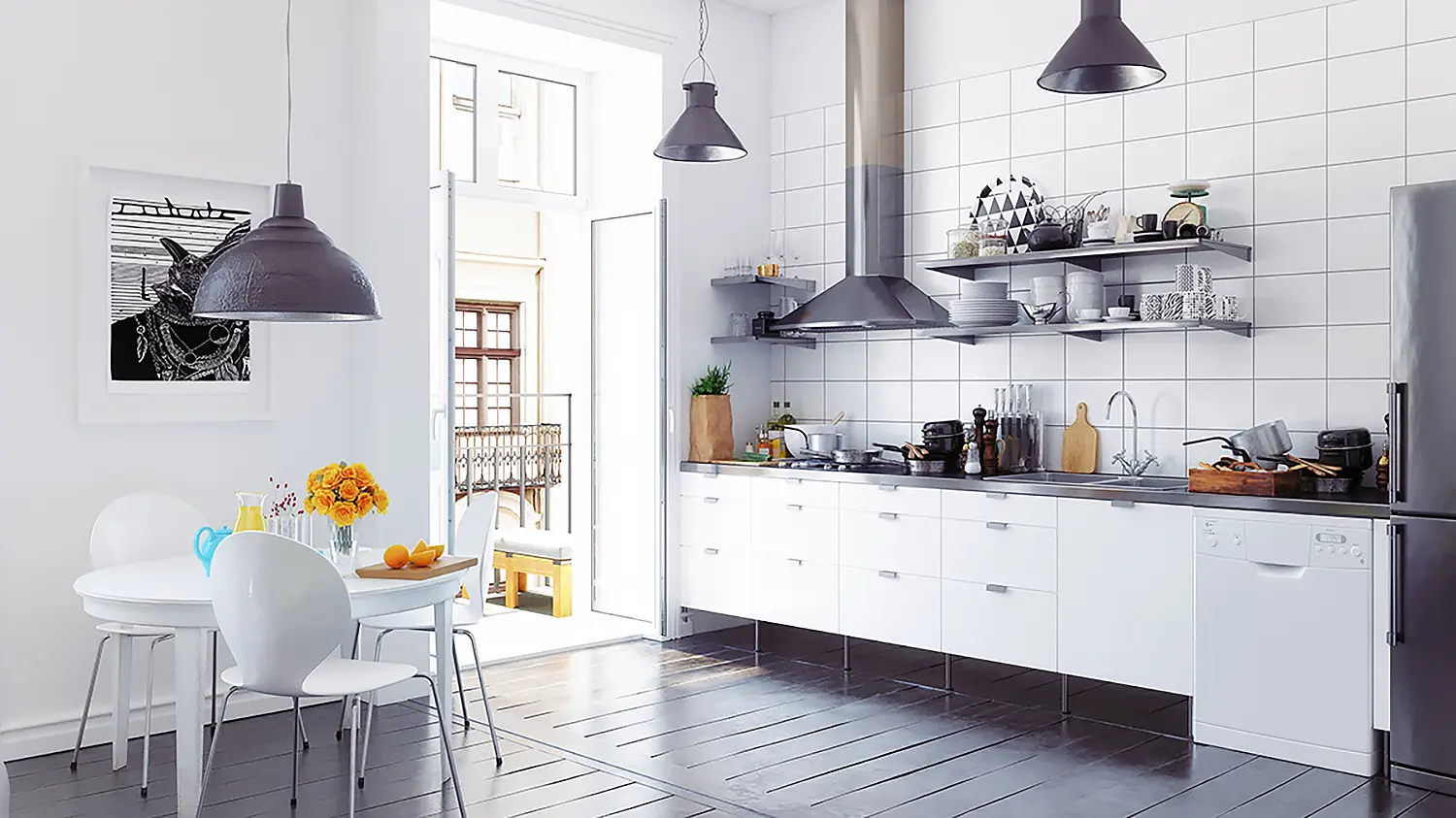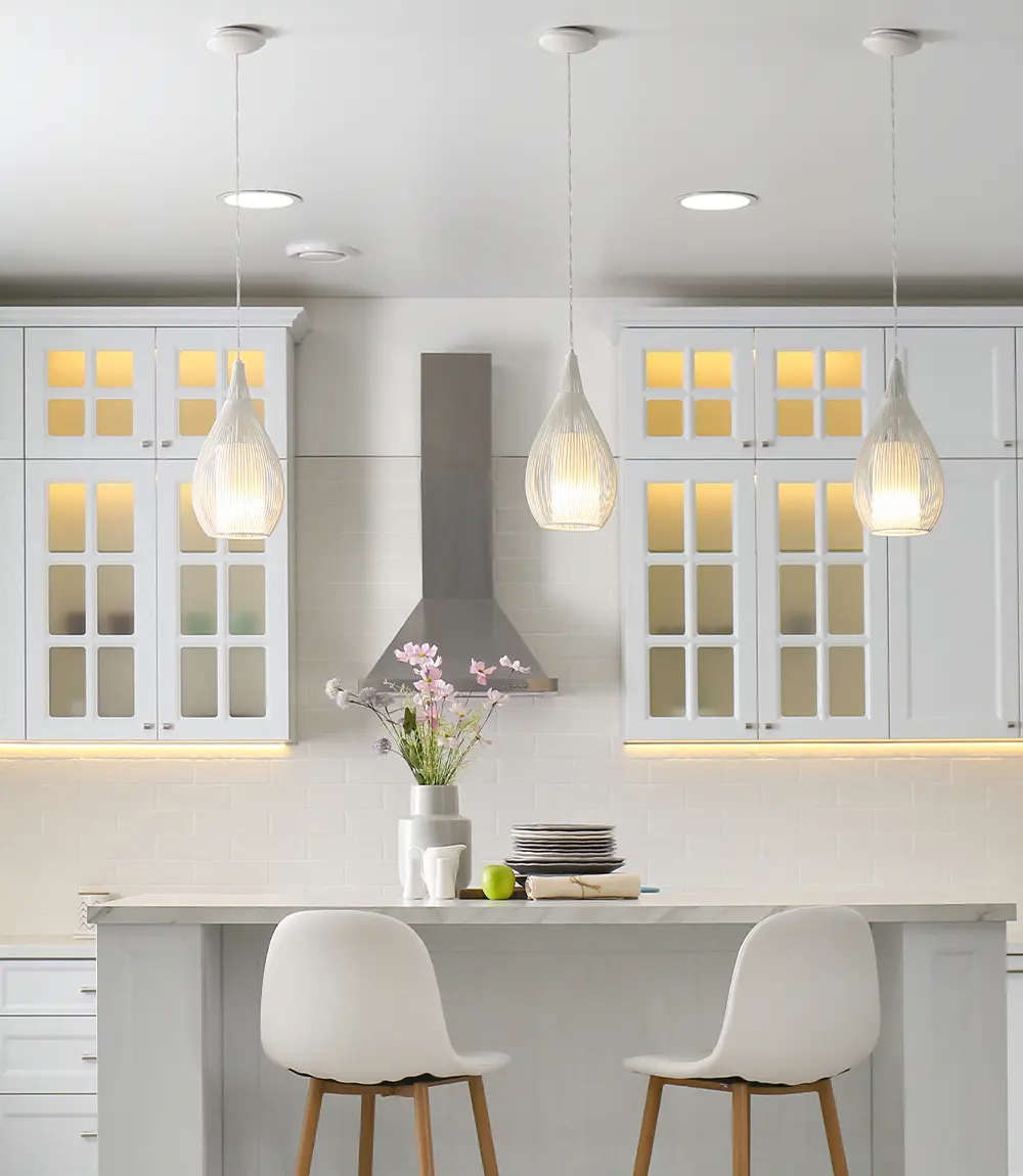 Для обеденной зоны выбирайте нейтральную или чуть теплую температуру освещения ― 3 000–4 000 К, потому что холодный свет может искажать вид продуктов и делать их менее аппетитными.