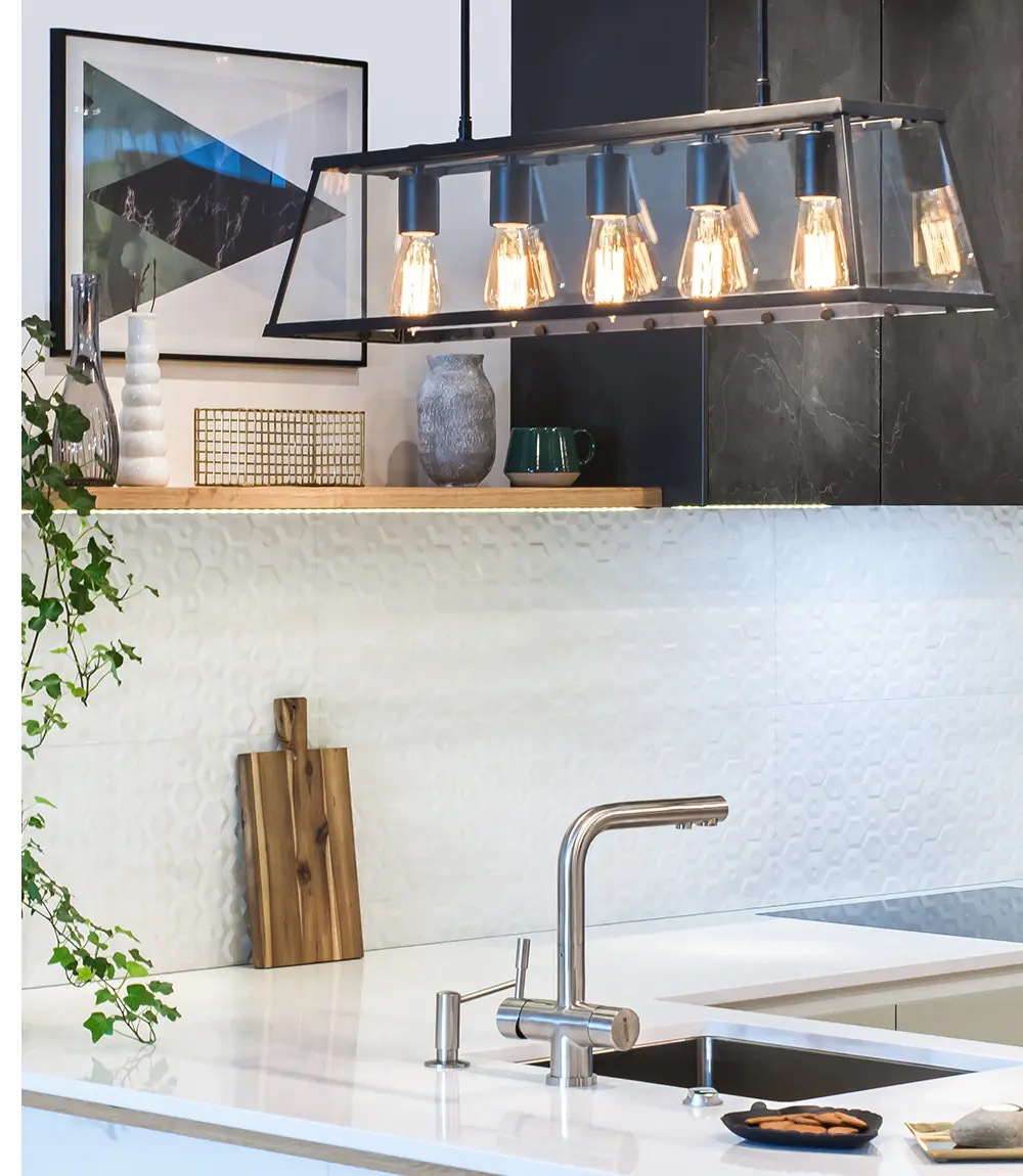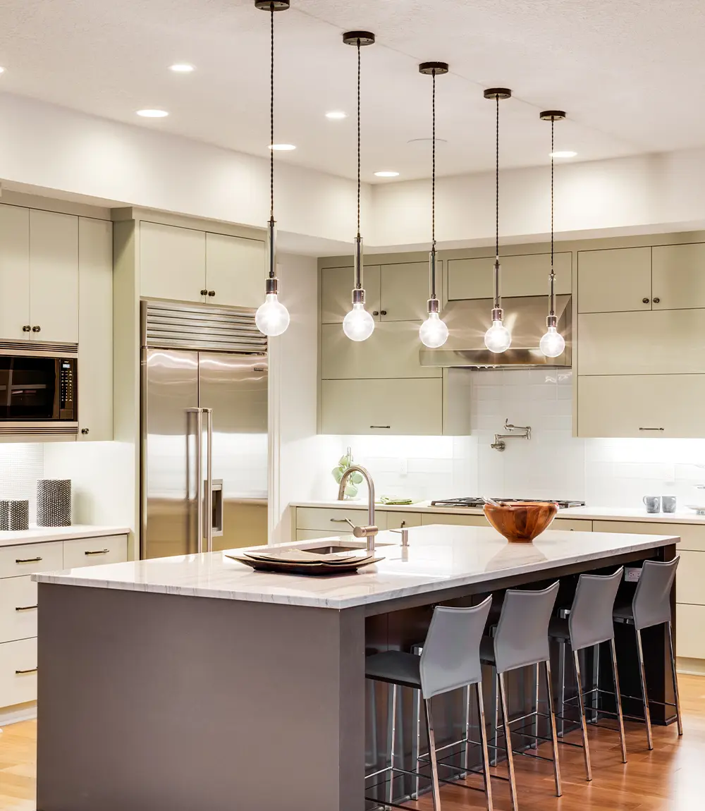 Количество светильников над стойкой зависит от ее длины. Оптимальное расстояние между подвесными светильниками — 40–45 см. Обычно вешают нечетное количество светильников — 3 или 5.