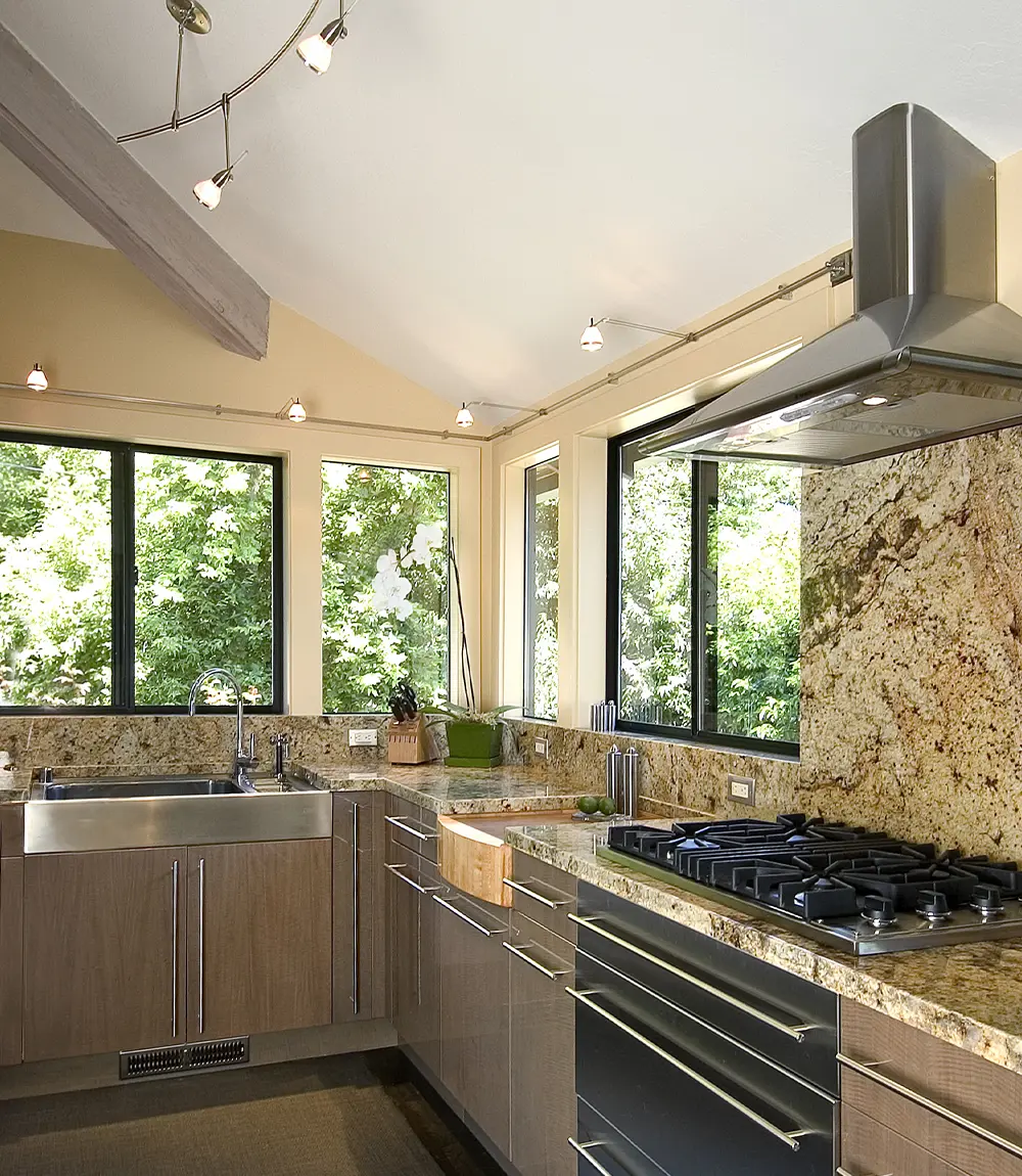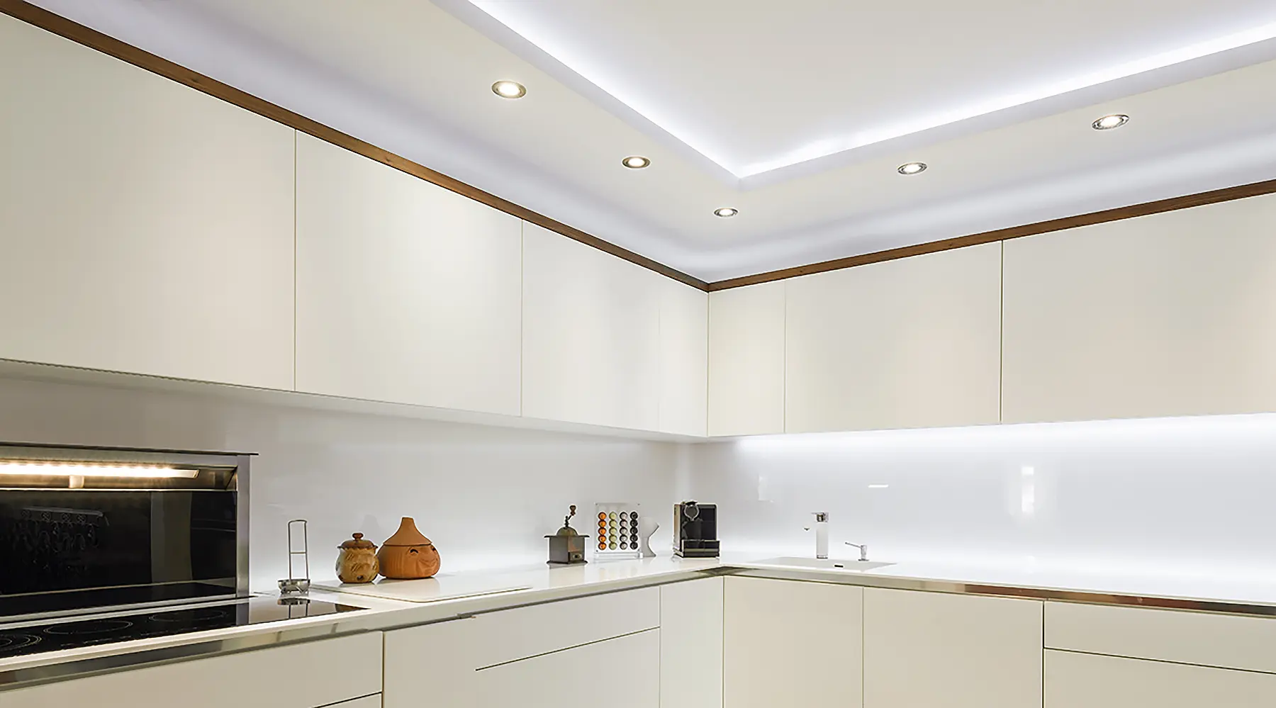 Для основного верхнего света на кухне дизайнеры советуют использовать встраиваемые (точечные) светильники или светодиодные ленты, встроенные в потолок, либо трековую систему спотовых светильников на штангах (рейлингах).