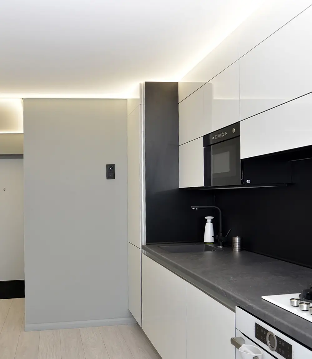 Если потолки высокие, прикрепите светодиодную ленту на «крыше» верхних шкафов и направьте поток света вверх. Он заполнит пространство между кухонным гарнитуром и потолком и визуально сделает потолок выше.