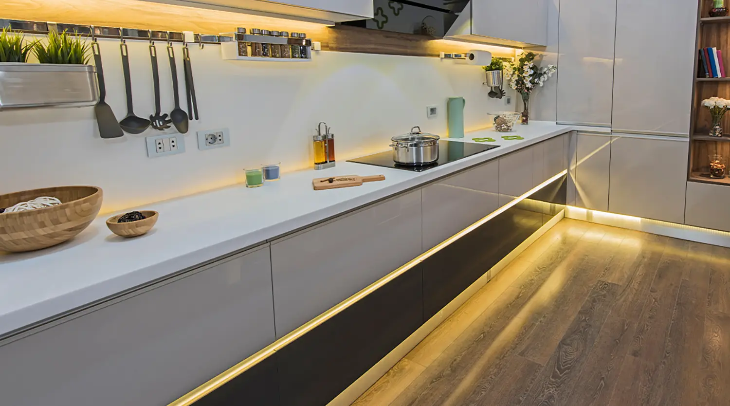 Второй способ — смонтировать подсветку в цоколь кухонного гарнитура по всей его длине. Для этого можно встроить светодиодную ленту в цоколь так, чтобы она светила в пол. Можно еще сделать цоколь из светопрозрачного материала и за ним прикрепить светодиодную ленту — цоколь превратится в «лайтбокс».