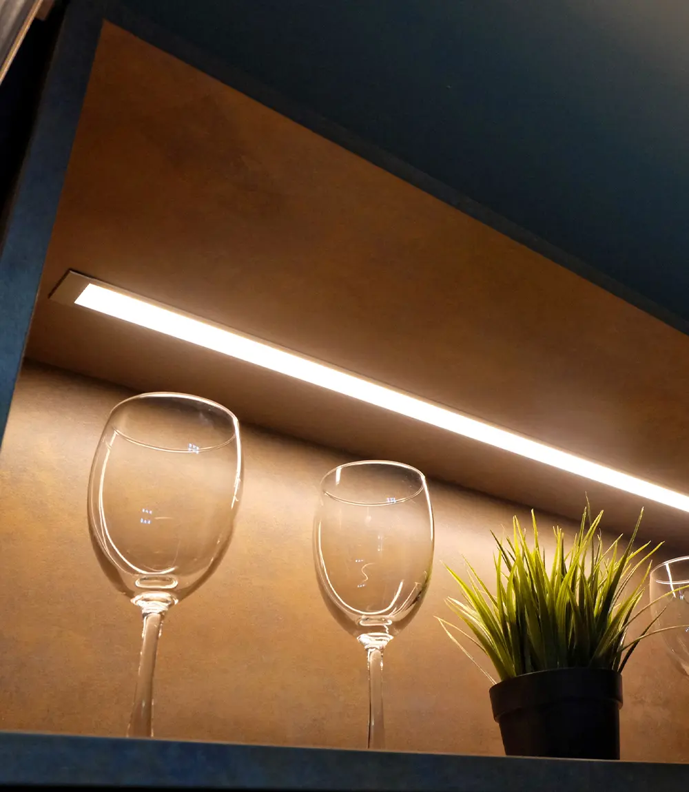 - Декоративная — для украшения подвесных шкафов со стеклом. Особенно эффектно это выглядит, если посуда в этих шкафах тоже стеклянная. Такую подсветку включают для создания атмосферы, даже когда на кухне не готовят.