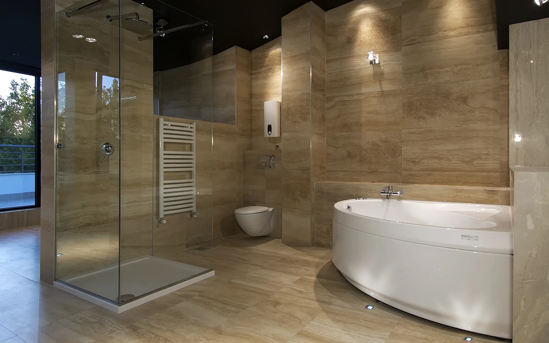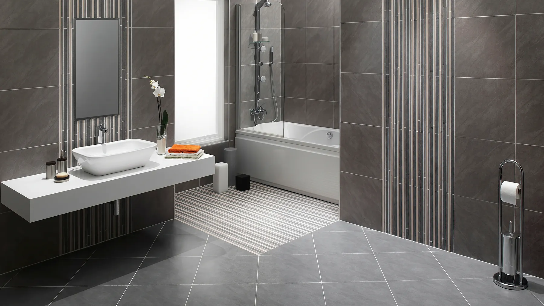 Крупная плитка на стенах и полу создает впечатление целостности пространства, визуально расширяя помещение. Большими считают модели с размером одной из сторон от 60 см. Чем крупнее плитка, тем проще она в укладке, ведь швов будет меньше. А затирка в тон создаст эффект единой поверхности.