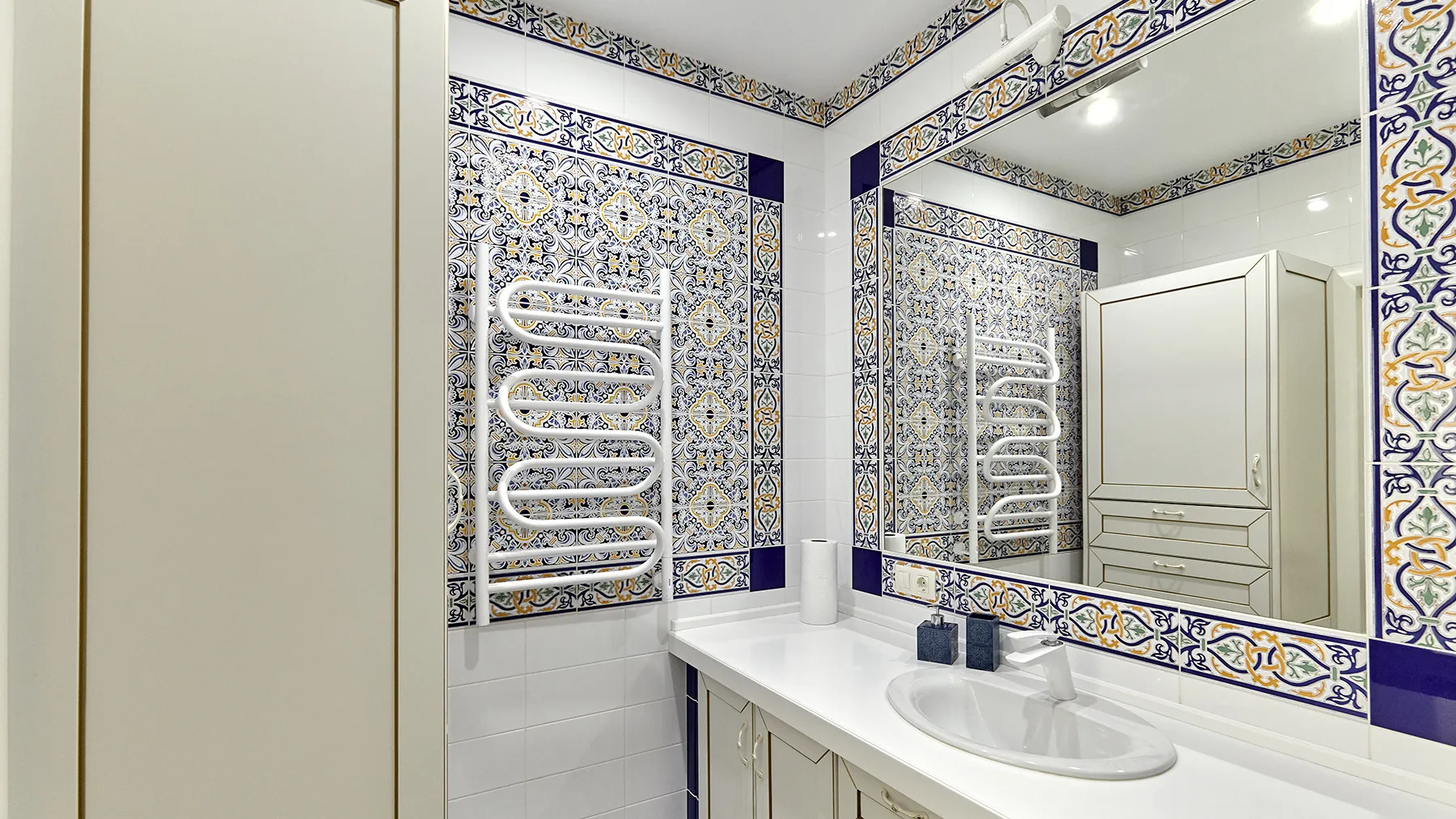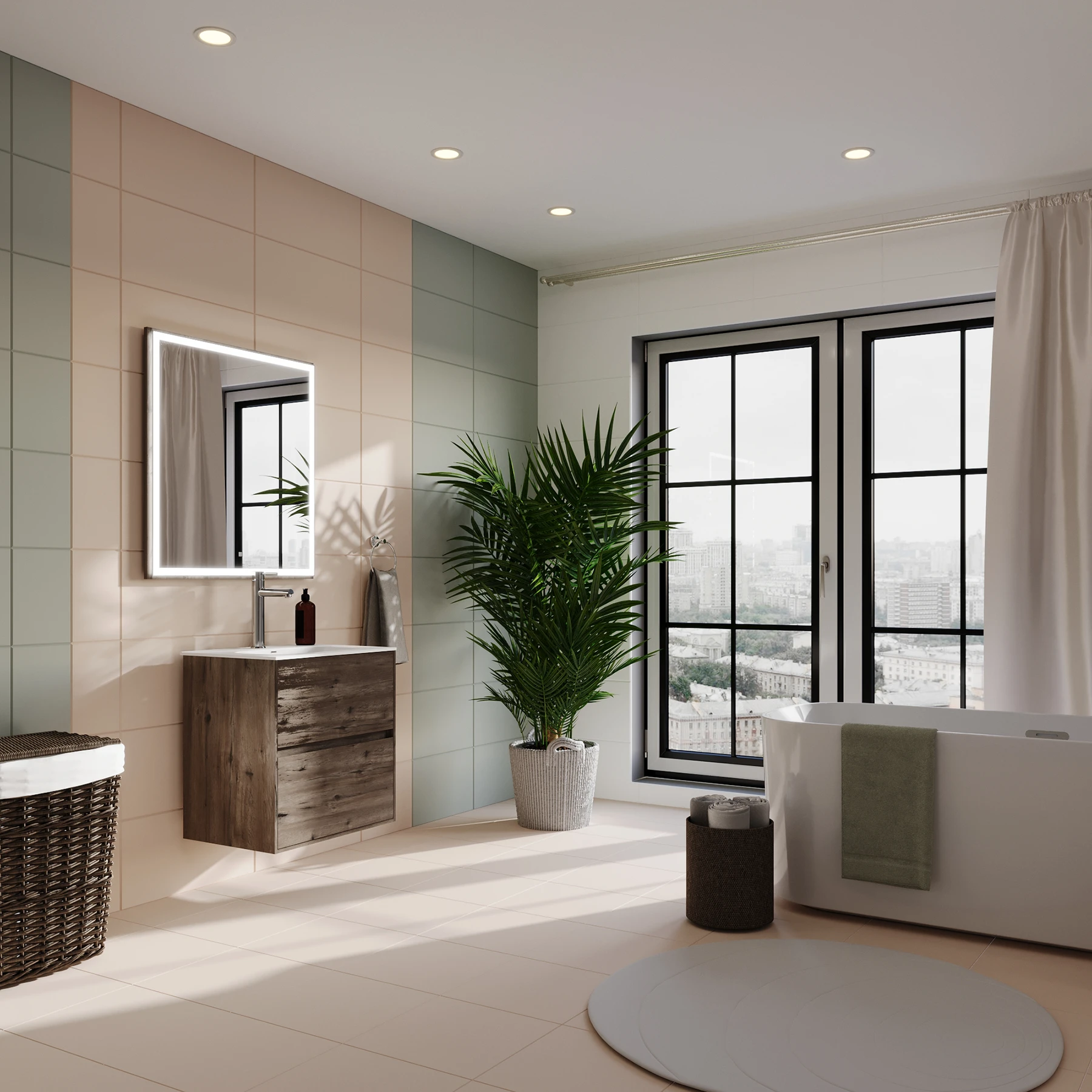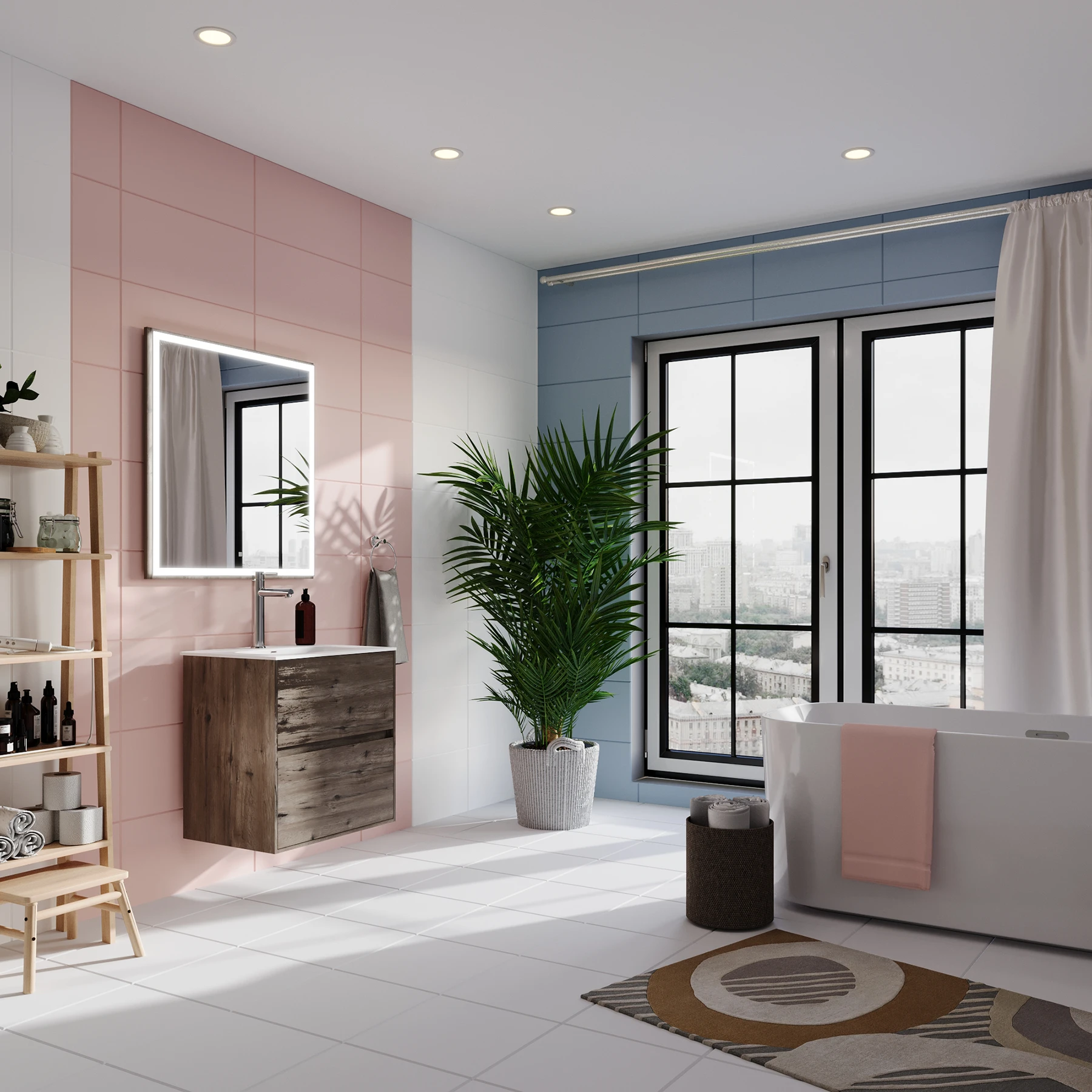 В тренде 2025 светлые и натуральные цвета — это идеальная база для любых дизайнерских решений. Холодные оттенки зрительно увеличивают пространство, а теплые делают интерьер уютнее. Впрочем, их можно комбинировать между собой. Пример такого сочетания — дизайн в стиле Color Block, созданный с помощью капсульной коллекции Lavelly Monocromo. Цветная плитка выложена блоками, где холодные оттенки Blue и White чередуют с теплым Nude.