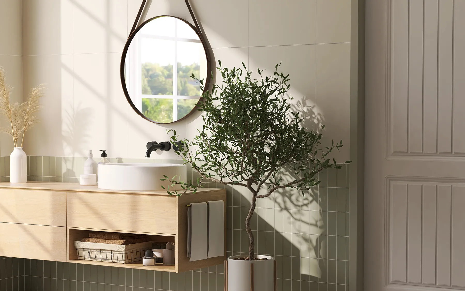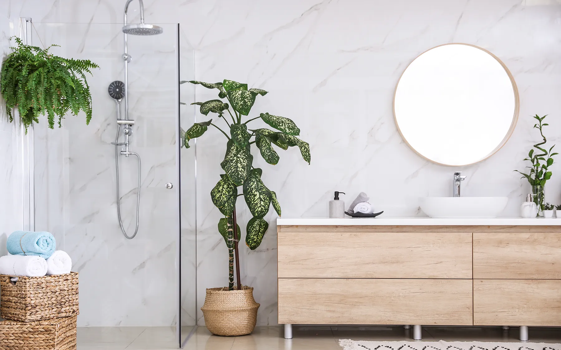 В качестве декора добавьте элементы из бамбука или живые растения. Для ванной подойдут драцена сандера, хлорофитум, монстера, циперус.